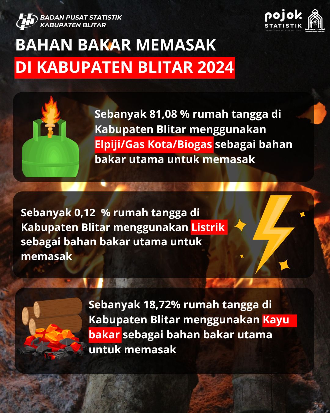 Pada tahun 2024, pola penggunaan bahan bakar untuk memasak di Kabupaten Blitar didominasi oleh gas LPG, yang digunakan oleh 81,08% rumah tangga. Sementara itu, sebanyak...