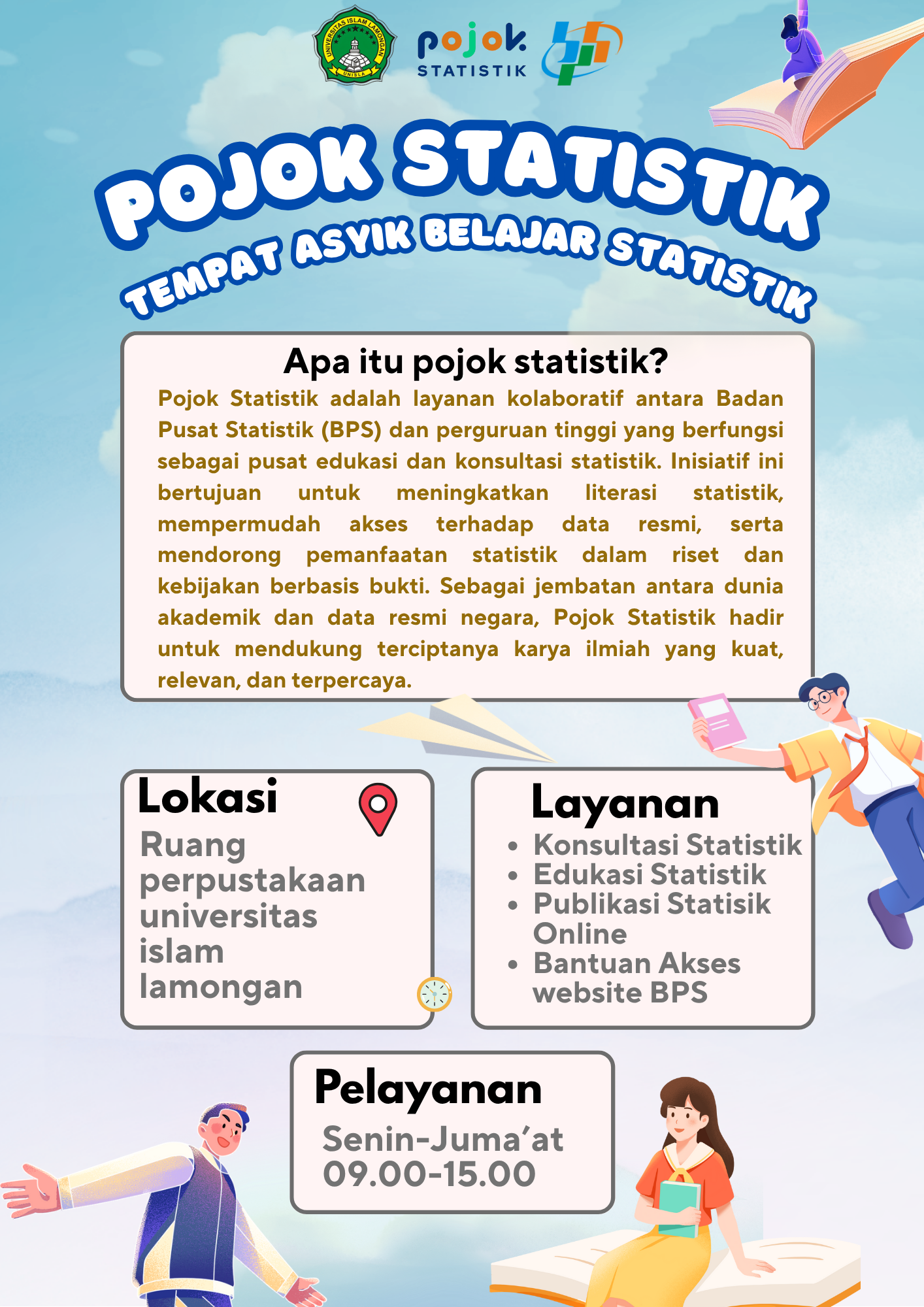 Pelayanan pojok statistik Unisla melayani berbagai layanan statistik seperti konsultasi data, romantik, akses website BPS, dan lain-lain. Pelayanan dilakukan secara online dan offline sesuai jadwal...