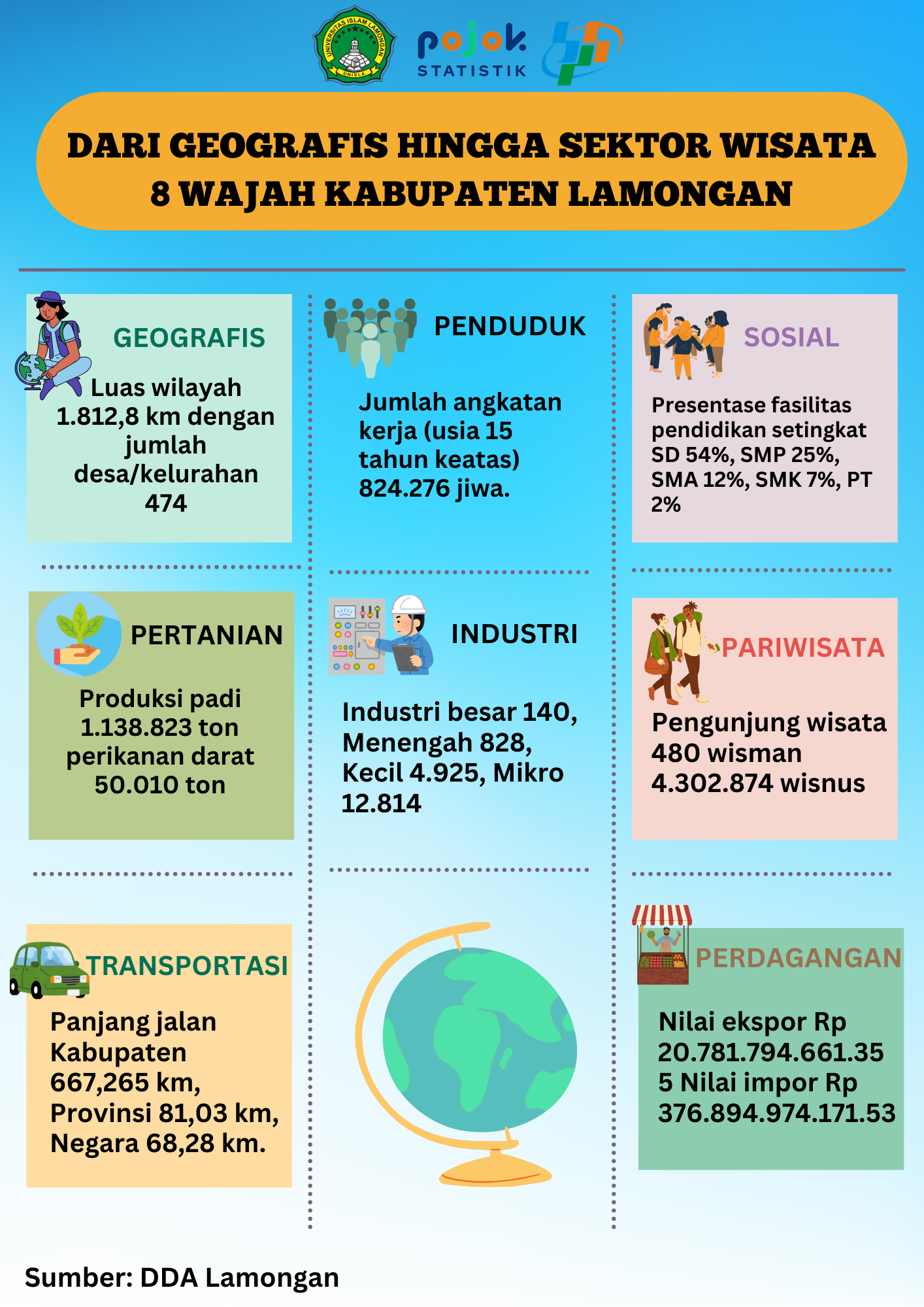 Yuk, intip sekilas potensi Lamongan dari berbagai sektor! Dari geografis, penduduk, sosial, pertanian, industri, pariwisata, transportasi, hingga perdagangan. Lamongan penuh potensi! ✨ #Lamongan #PotensiDaerah #FaktaLamongan