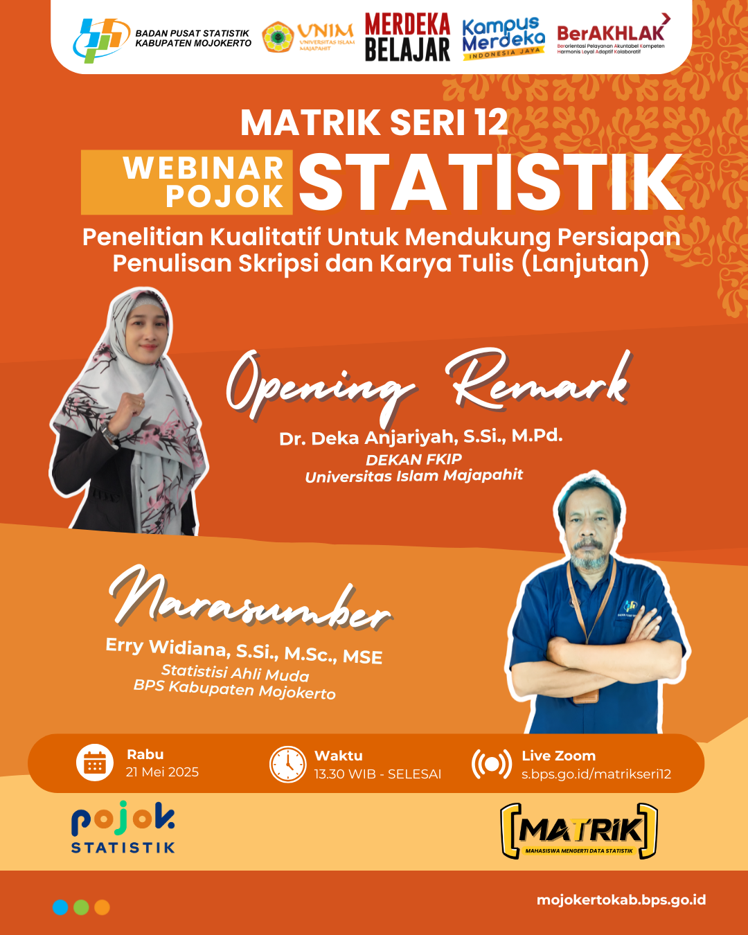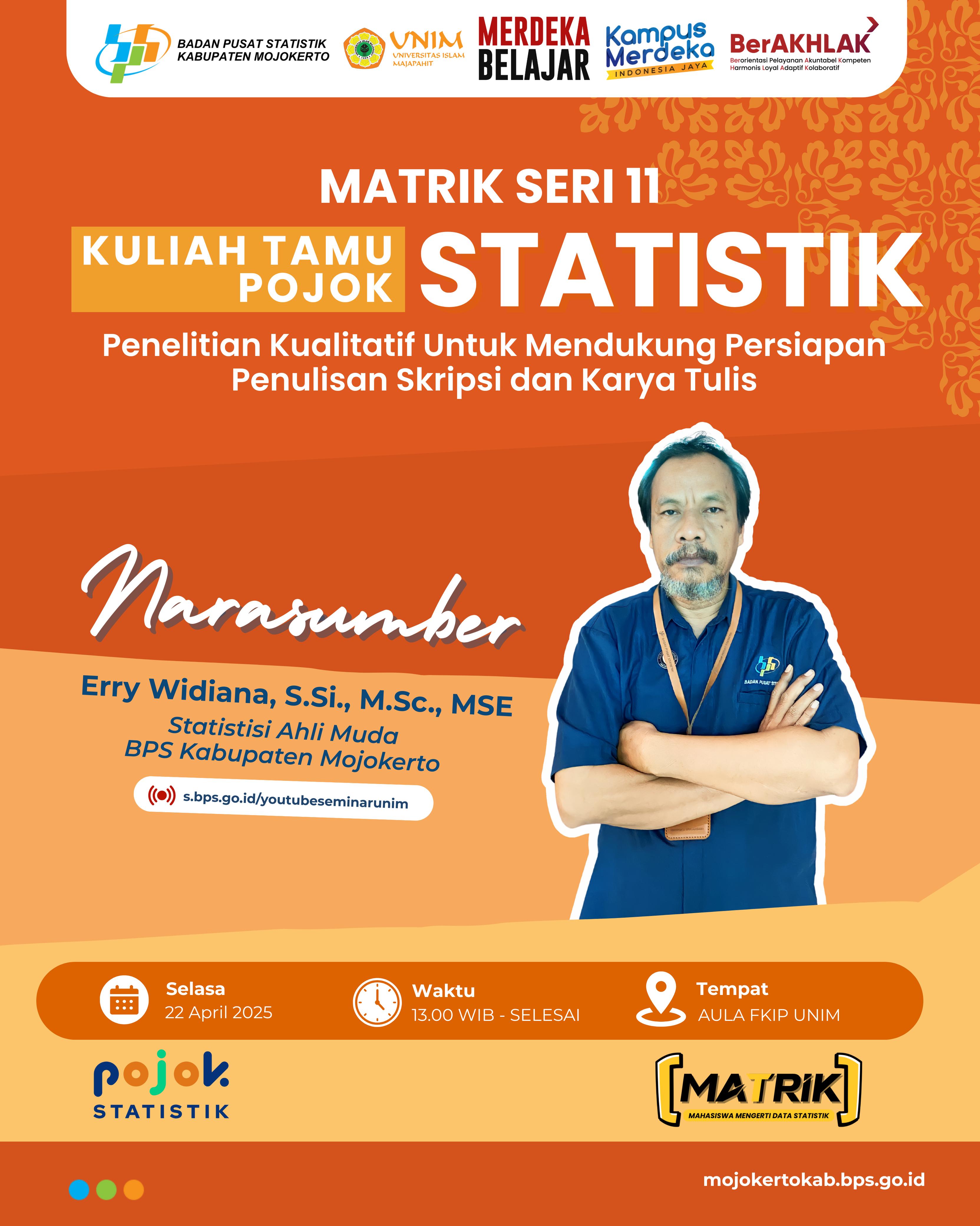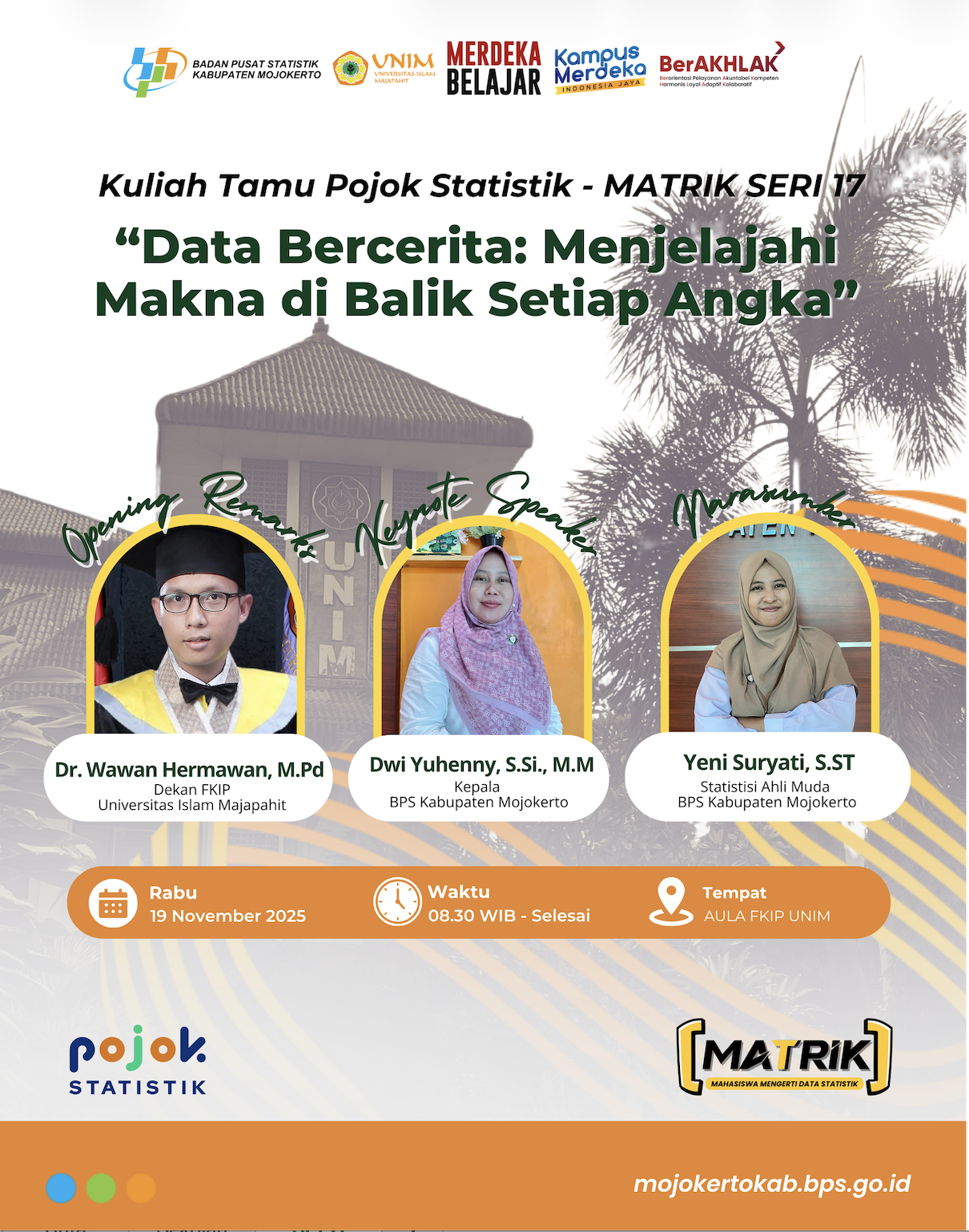 BPS Kabupaten Mojokerto yang berkolaborasi dengan Pojok Statistik UNIM menyenggarakan Matrik (Mahasiswa Mengerti Data Statistik) Seri 17 dalam bentuk Kuliah Tamu. Kuliah Tamu kali ini...