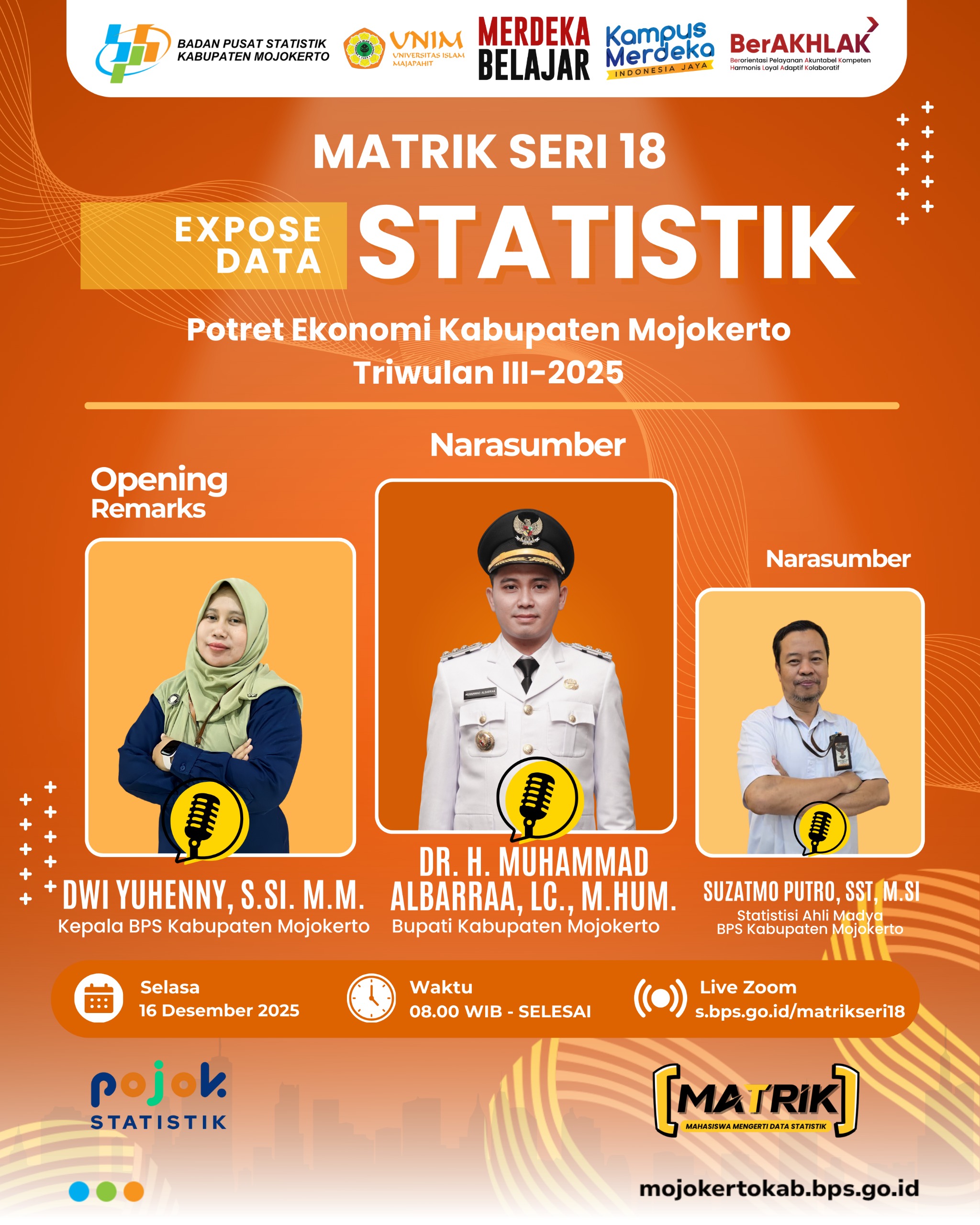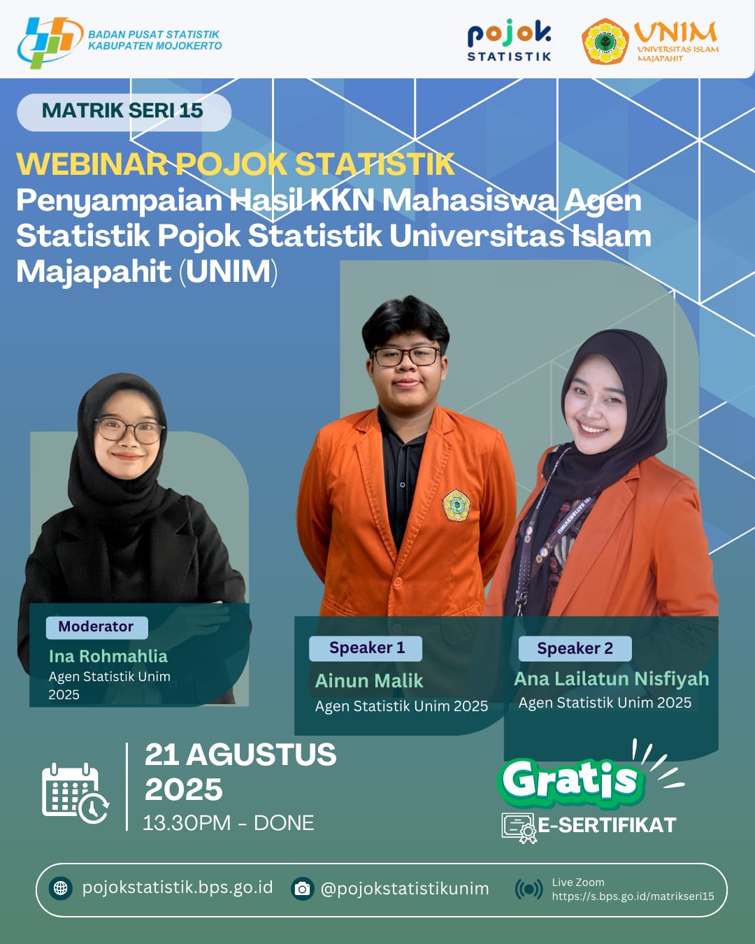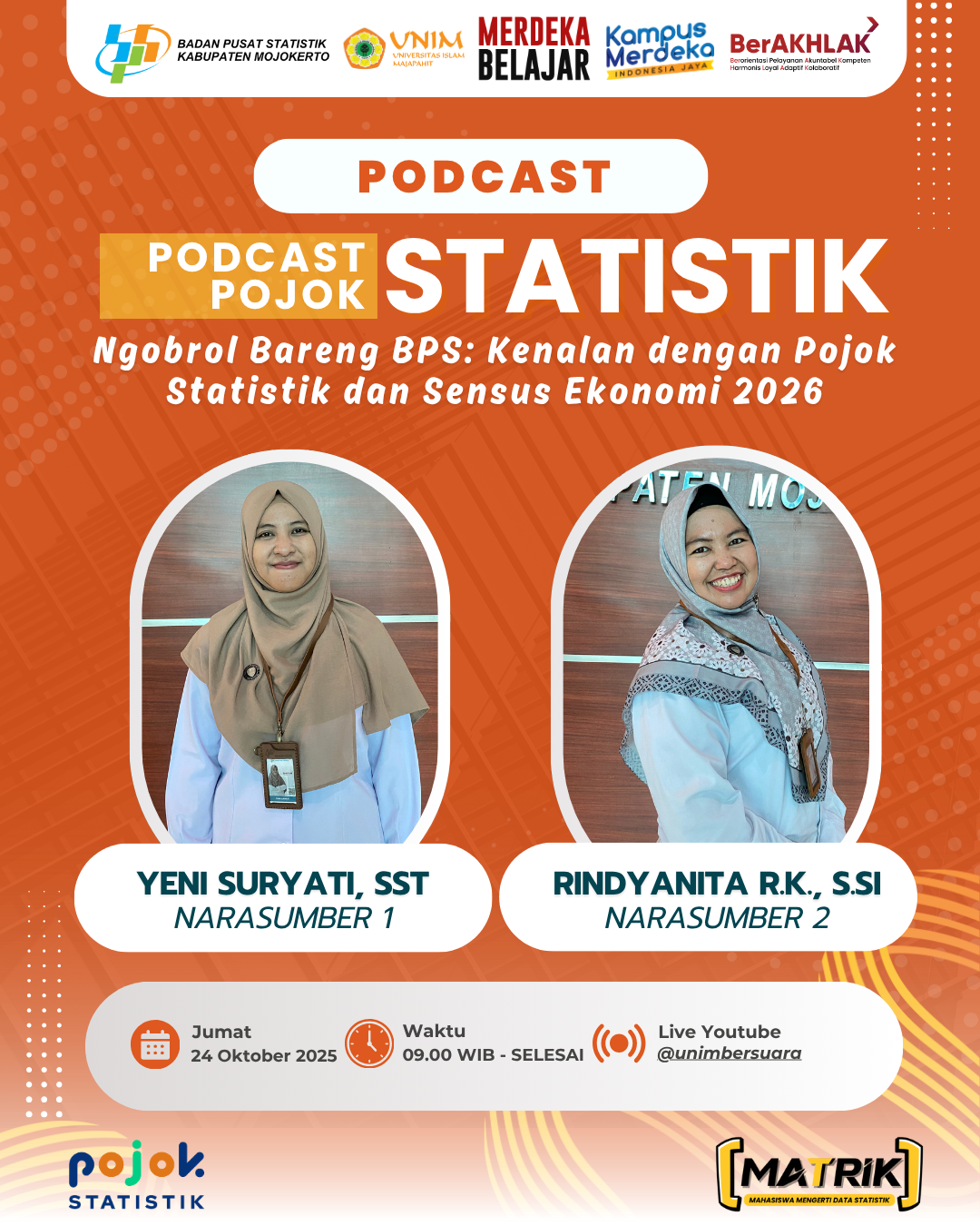 BPS Kabupaten Mojokerto yang berkolaborasi dengan Pojok Statistik UNIM menyenggarakan Matrik (Mahasiswa Mengerti Data Statistik) Seri 17 dalam bentuk Kuliah Tamu. Kuliah Tamu kali ini...