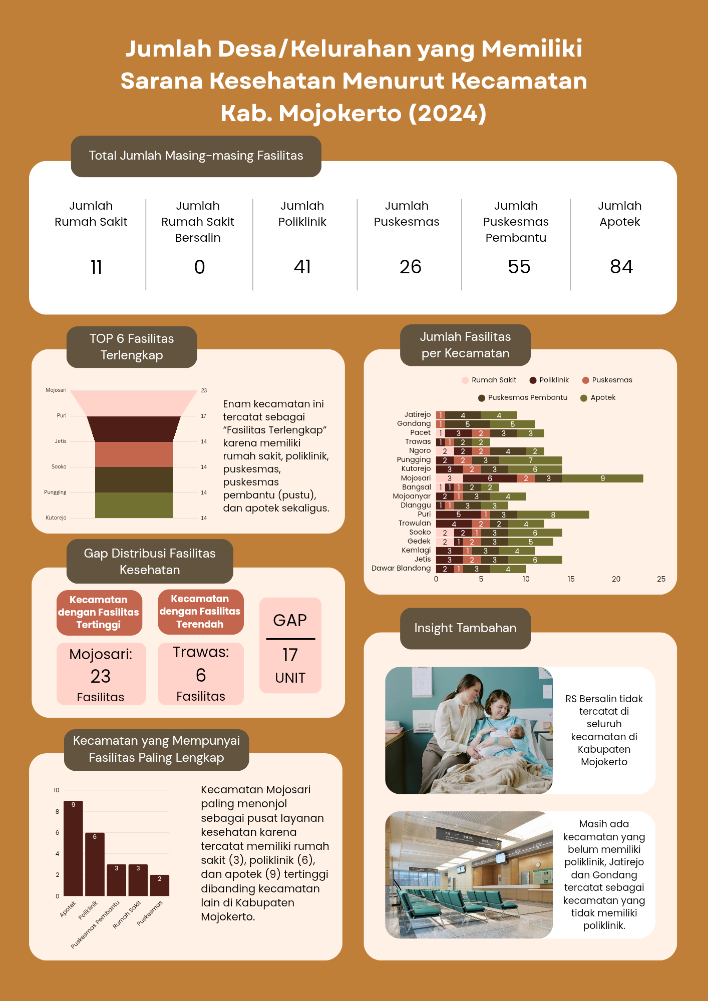 Jumlah Desa/Kelurahan yang memiliki sarana kesehatan menurut kecamatan di Kabupaten Mojokerto tahun 2024