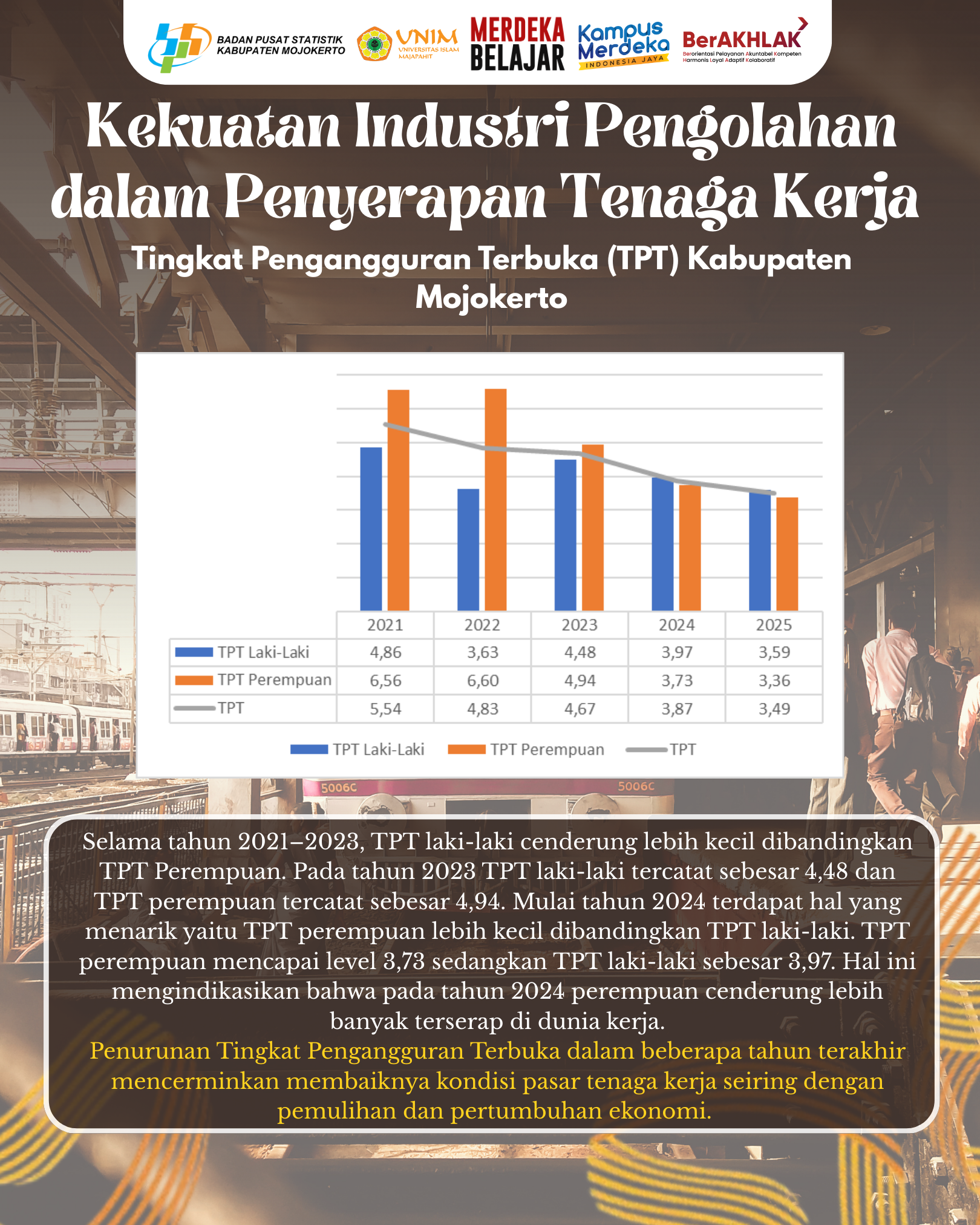 Keadaan Ketenagakerjaan Kab. Mojokerto tahun 2025 menunjukkan penurunan Tingkat Pengangguran Terbuka (TPT) 0.38 persen dibanding tahun sebelumnya menjadi 3.49 persen poin. Seiring dengan itu, Tingkat...