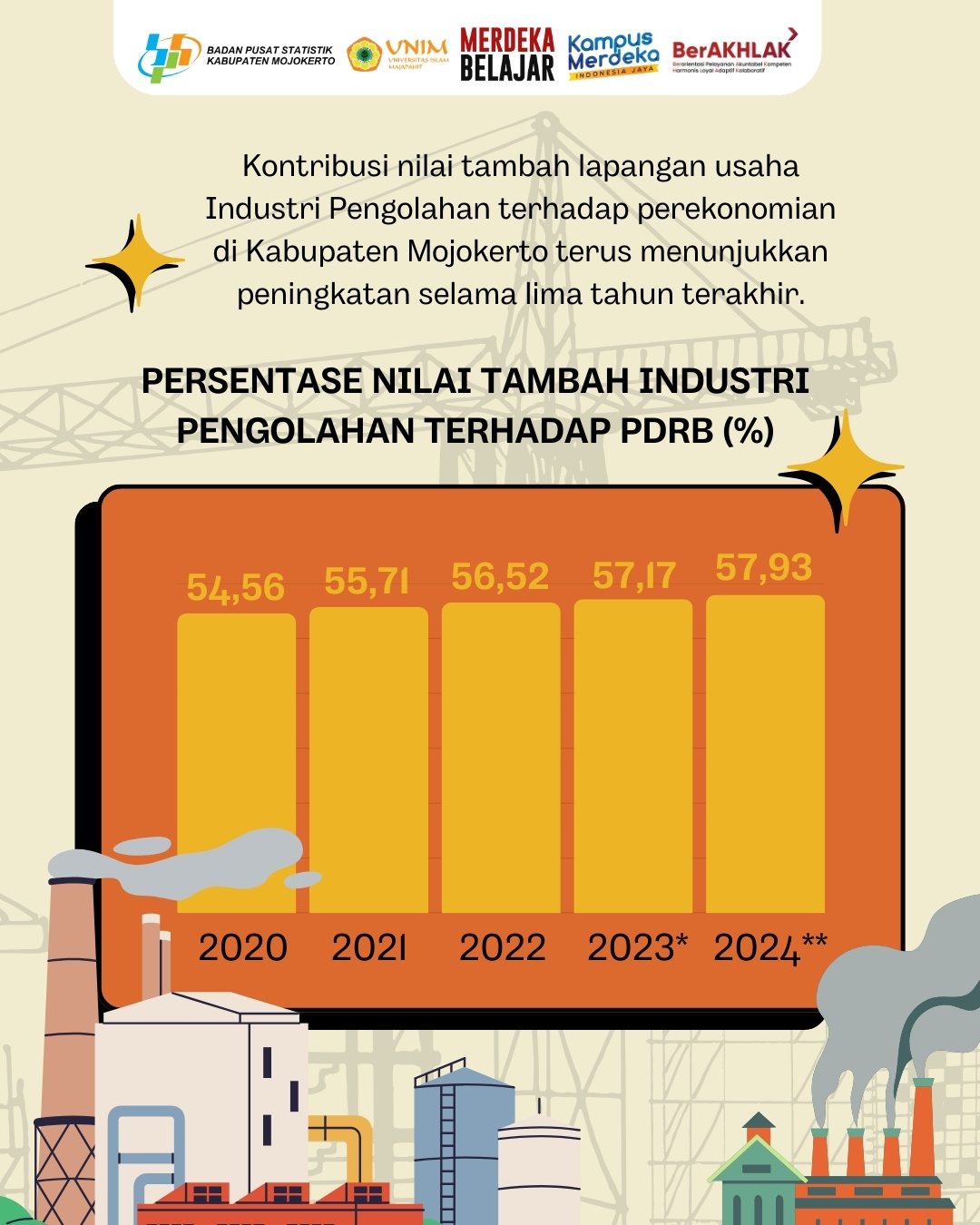 Kontribusi nilai tambah lapangan usaha Industri Pengolahan terhadap perekonomian di Kabupaten Mojokerto terus menunjukkan peningkatan selama lima tahun terakhir.