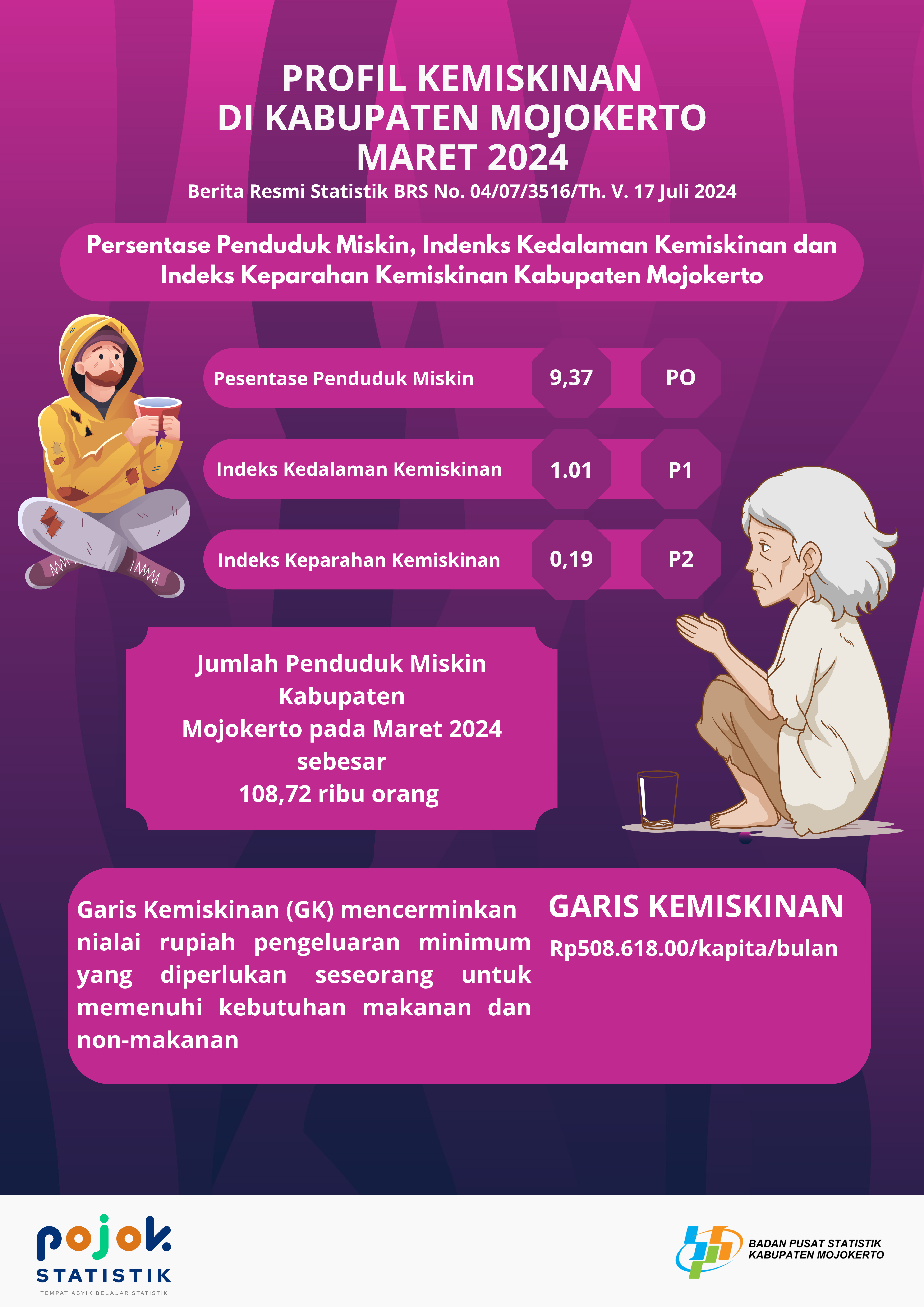 Persentase penduduk miskin tahun 2024 ialah sebesar 9,37 persen, sedangkan Indeks Kedalaman Kemiskinan ialah sebesar 1,01 dan Indeks Keparahan Kemiskinan ialah sebesar 0,19.