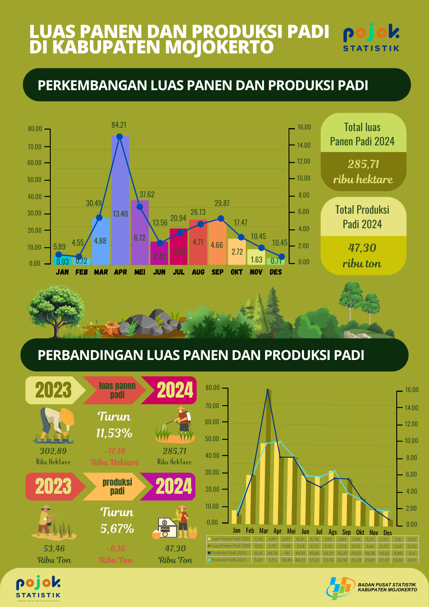 Luas Panen dan Produksi Padi bulan Januari-Desember 2024 mengalami keadaan yang fluktuatif. Total Produksi Padi tahun 2024 ialah sebesar 47,3 ribu ton, sedangkan luas panen...