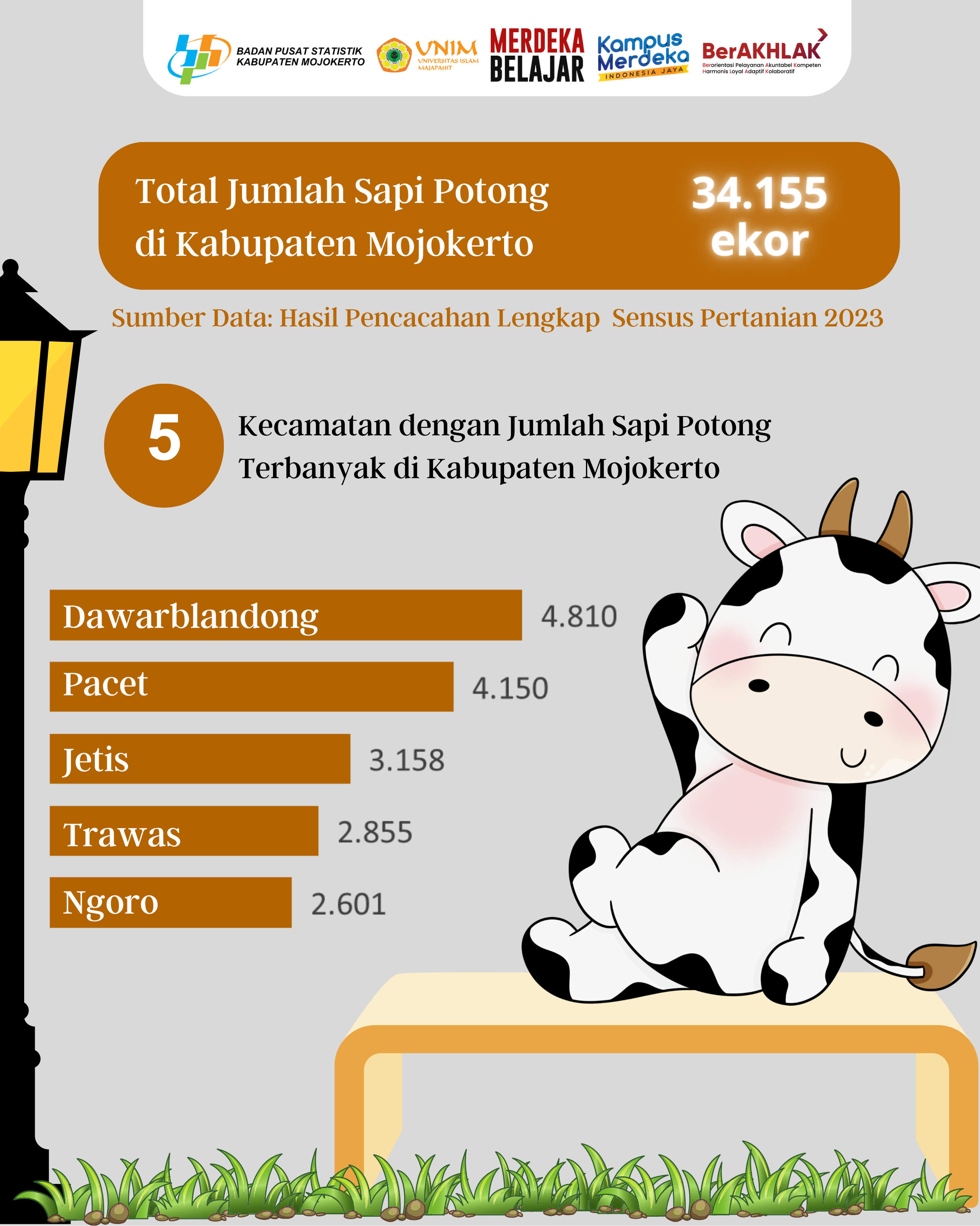 Total Jumlah Sapi Potong di Kabupaten Mojokerto ialah 34.155 ekor pada tahun 2023.