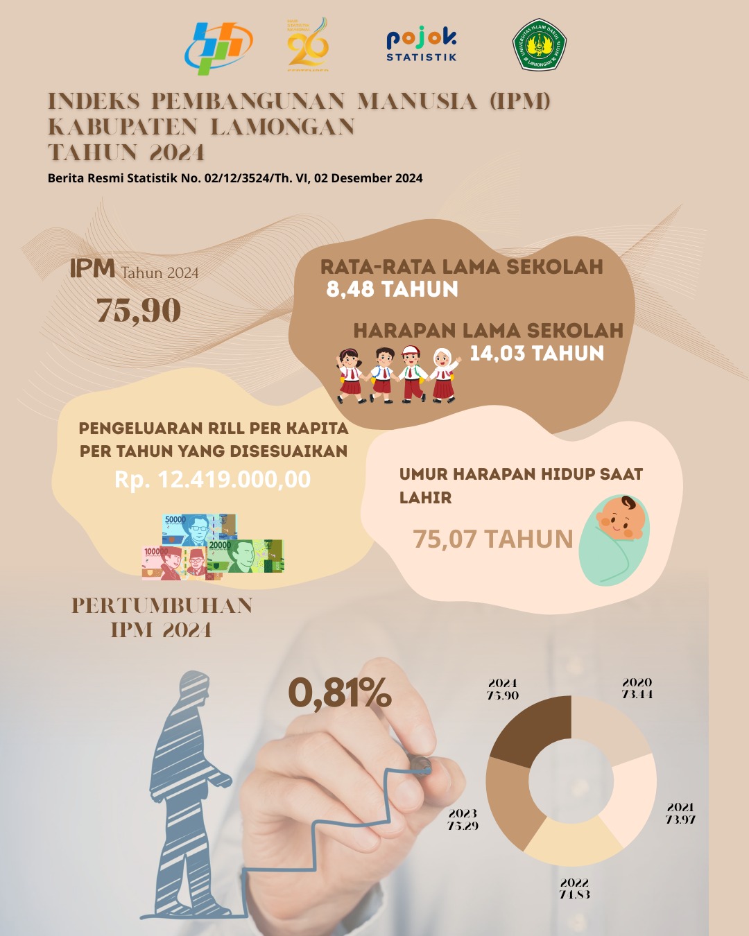 IPM Kabupaten Lamongan tahun 2024 mencapai 75,90, menunjukkan peningkatan dari tahun-tahun sebelumnya. * Harapan hidup: 75,07 tahun. * Rata-rata lama sekolah: 8,48 tahun. * Pengeluaran...