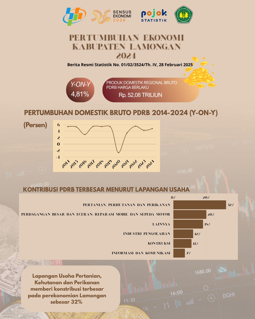 Ekonomi Lamongan 2024 tumbuh 4,81% dengan PDRB Rp52,08 Triliun. Sektor pertanian masih jadi penyumbang terbesar, yakni 32%