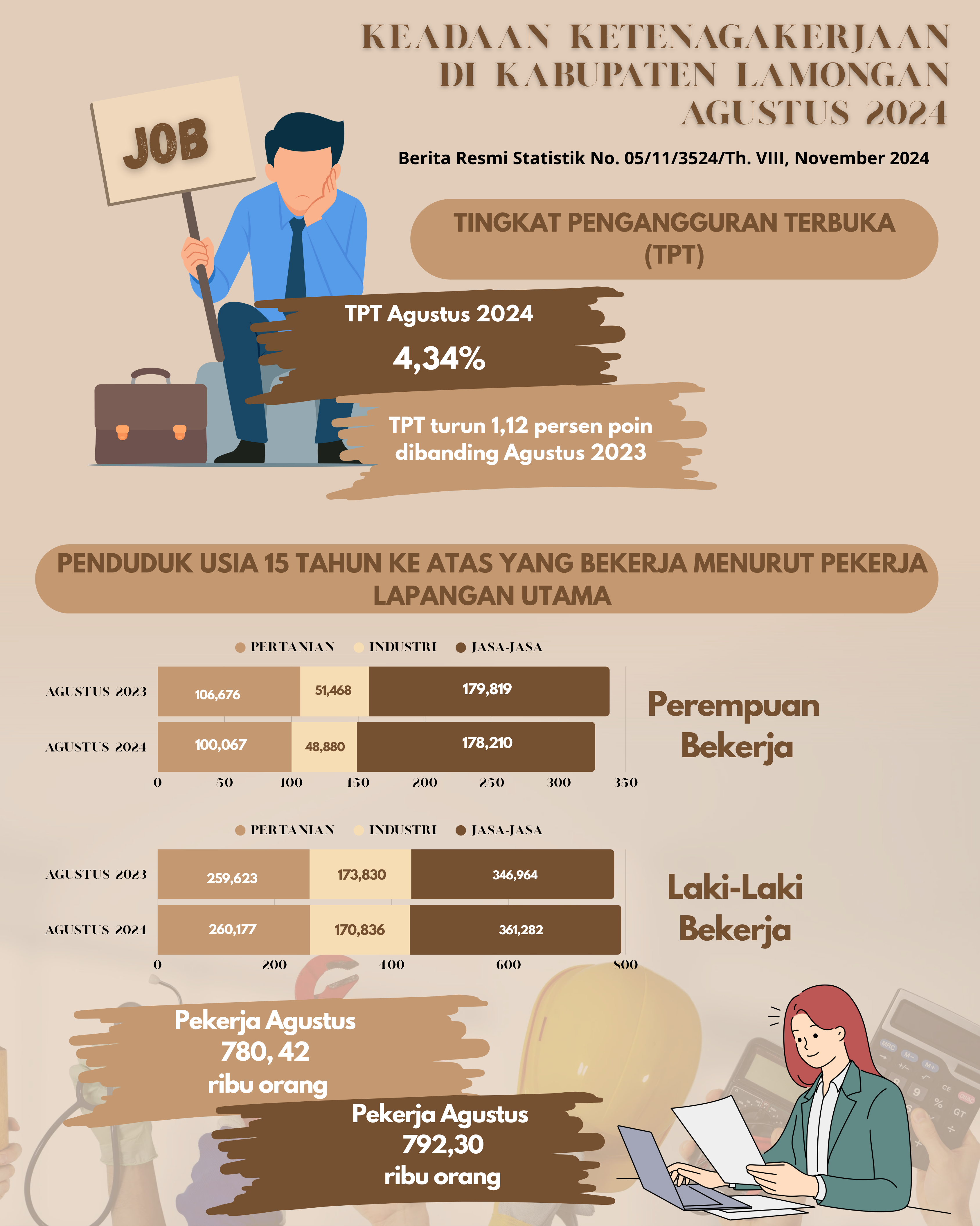 data ketenagakerjaan Kabupaten Lamongan Agustus 2024. Tingkat Pengangguran Terbuka (TPT) tercatat sebesar 4,34%, turun 1,12 persen poin dibanding Agustus 2023. Jumlah penduduk bekerja mencapai 792,30...