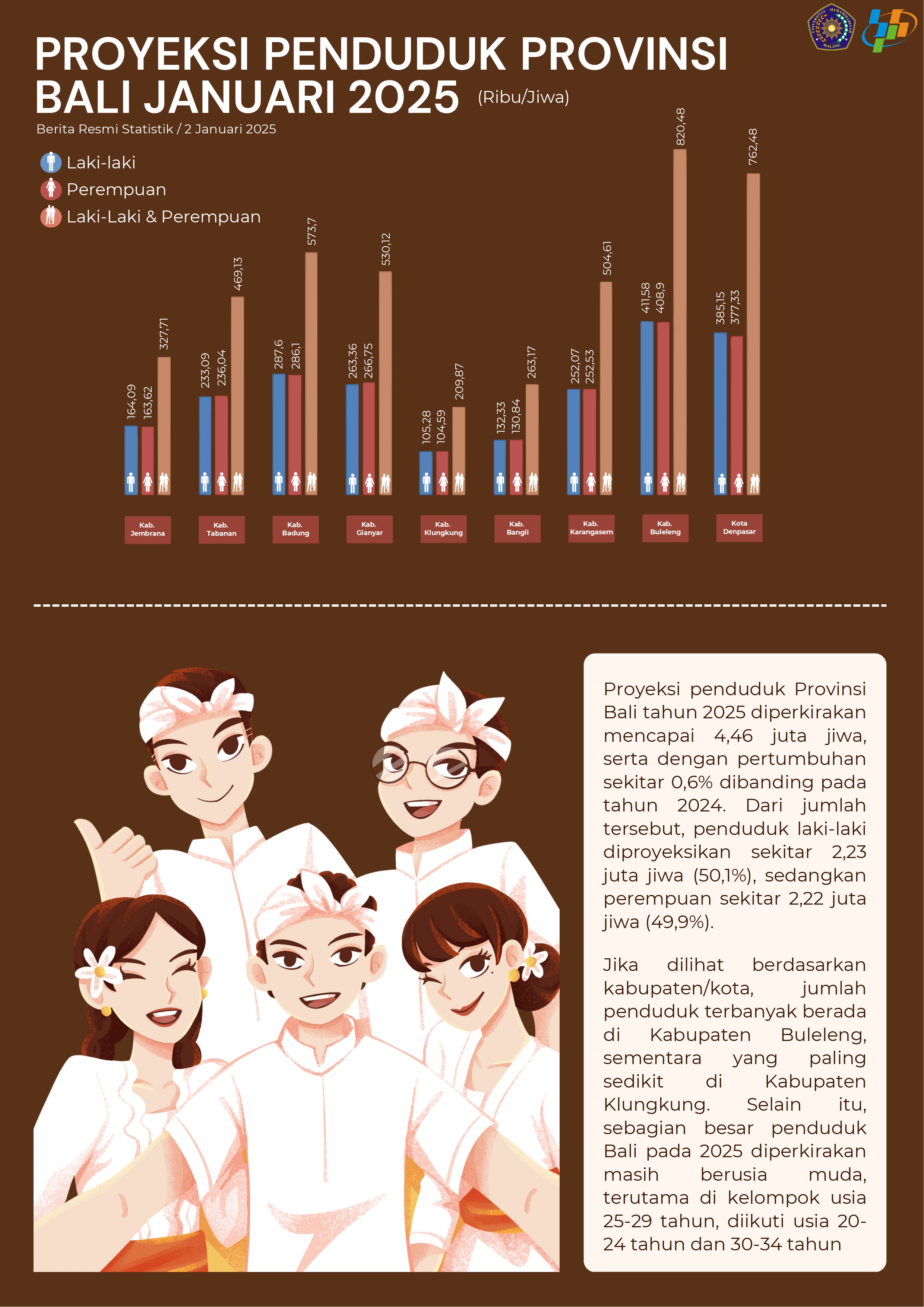 Proyeksi penduduk Provinsi Bali tahun 2025 diperkirakan mencapai 4,46 juta jiwa, serta dengan pertumbuhan sekitar 0,6% dibanding pada tahun 2024