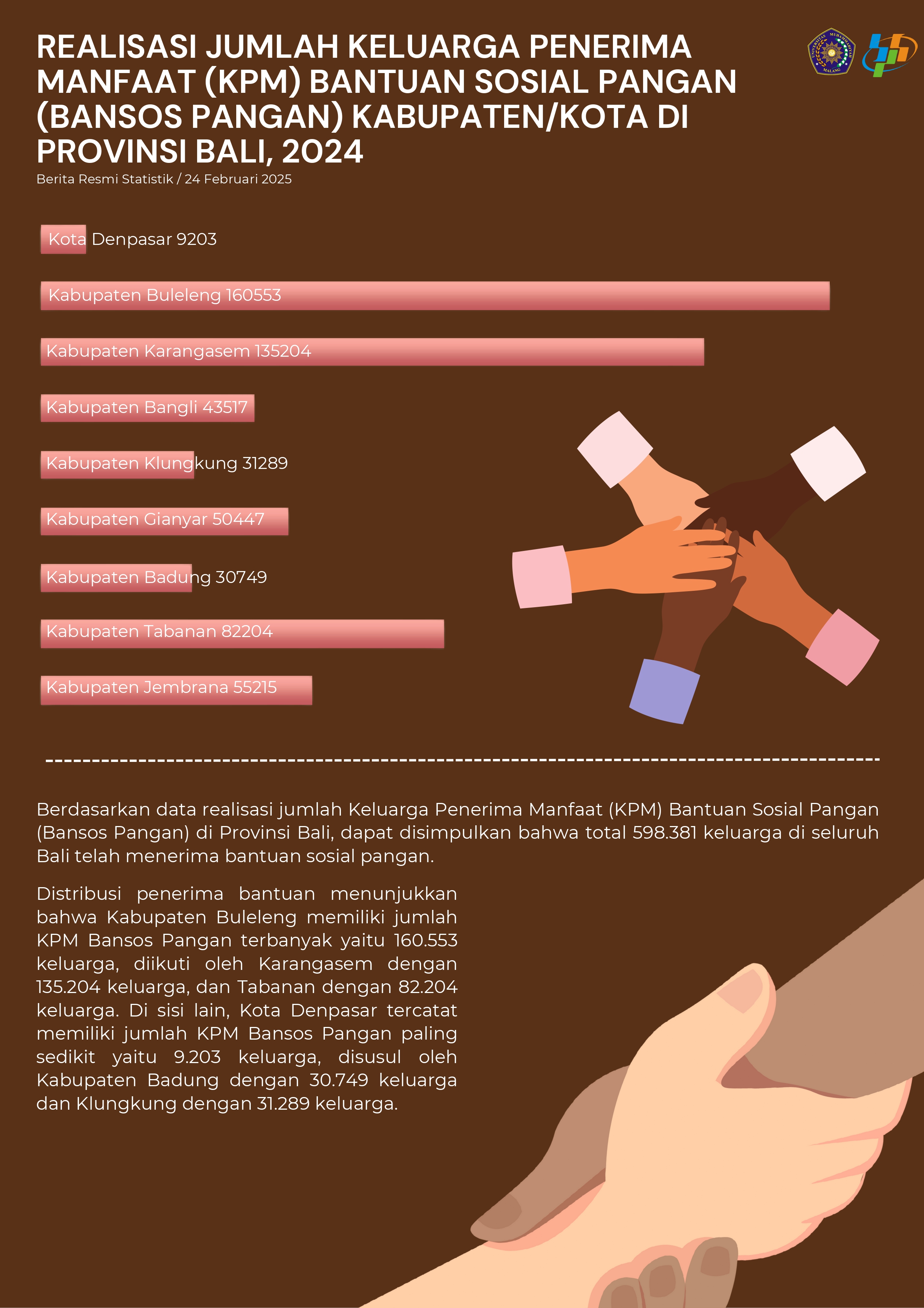 Berdasarkan data raealisasi jumlah Keluarga Penerima Manfaat (KMP) Bansos Pangan dapat disimpulkan bahwa total 598.381 keluarga di seluruh Bali telah menerima Bantuan sosial pangan.