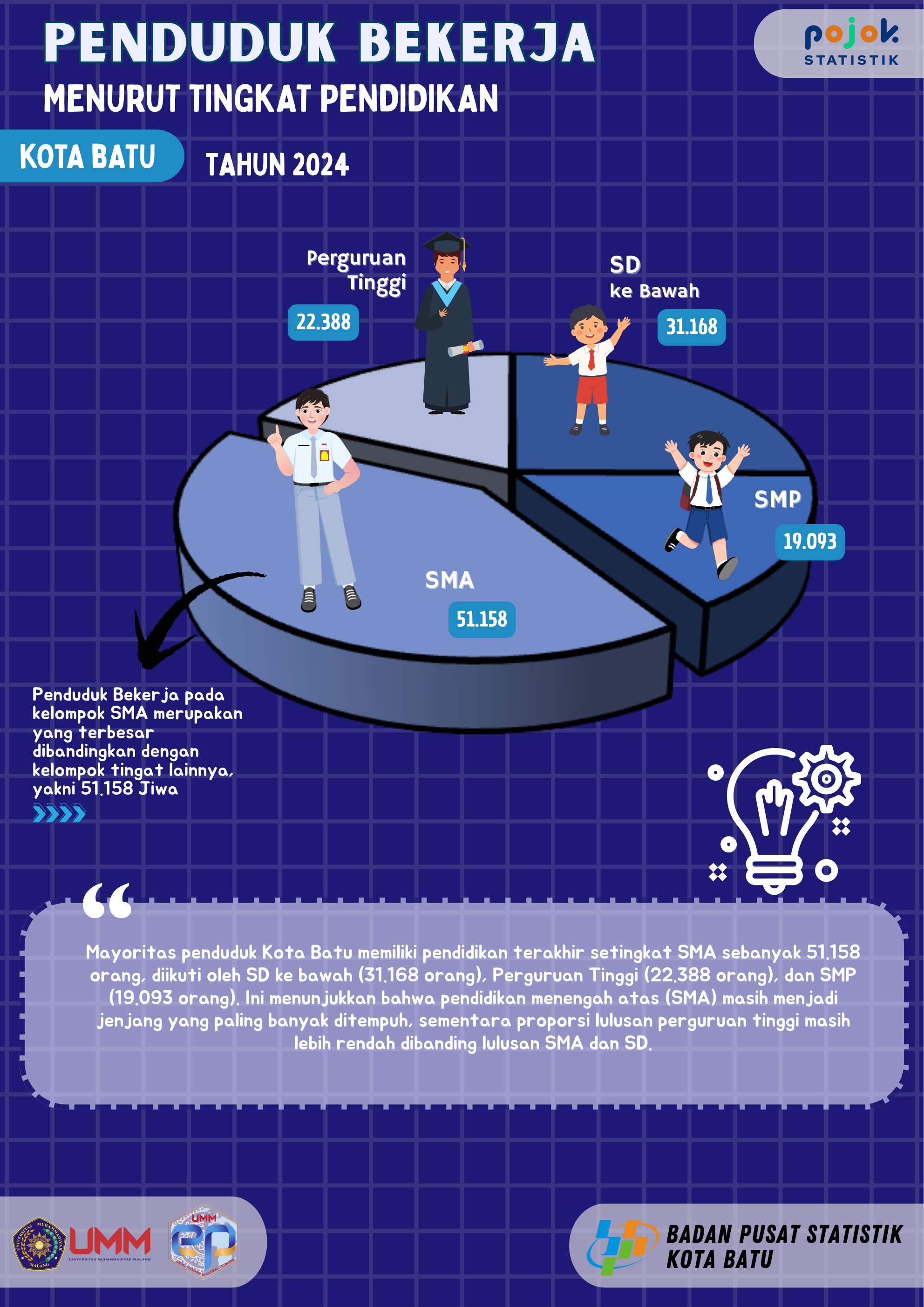 Penduduk Bekerja pada kelompok SMA merupakan yang terbesar dibandingkan denga kelompok tingkat lainya yakni 51.158 jiwa