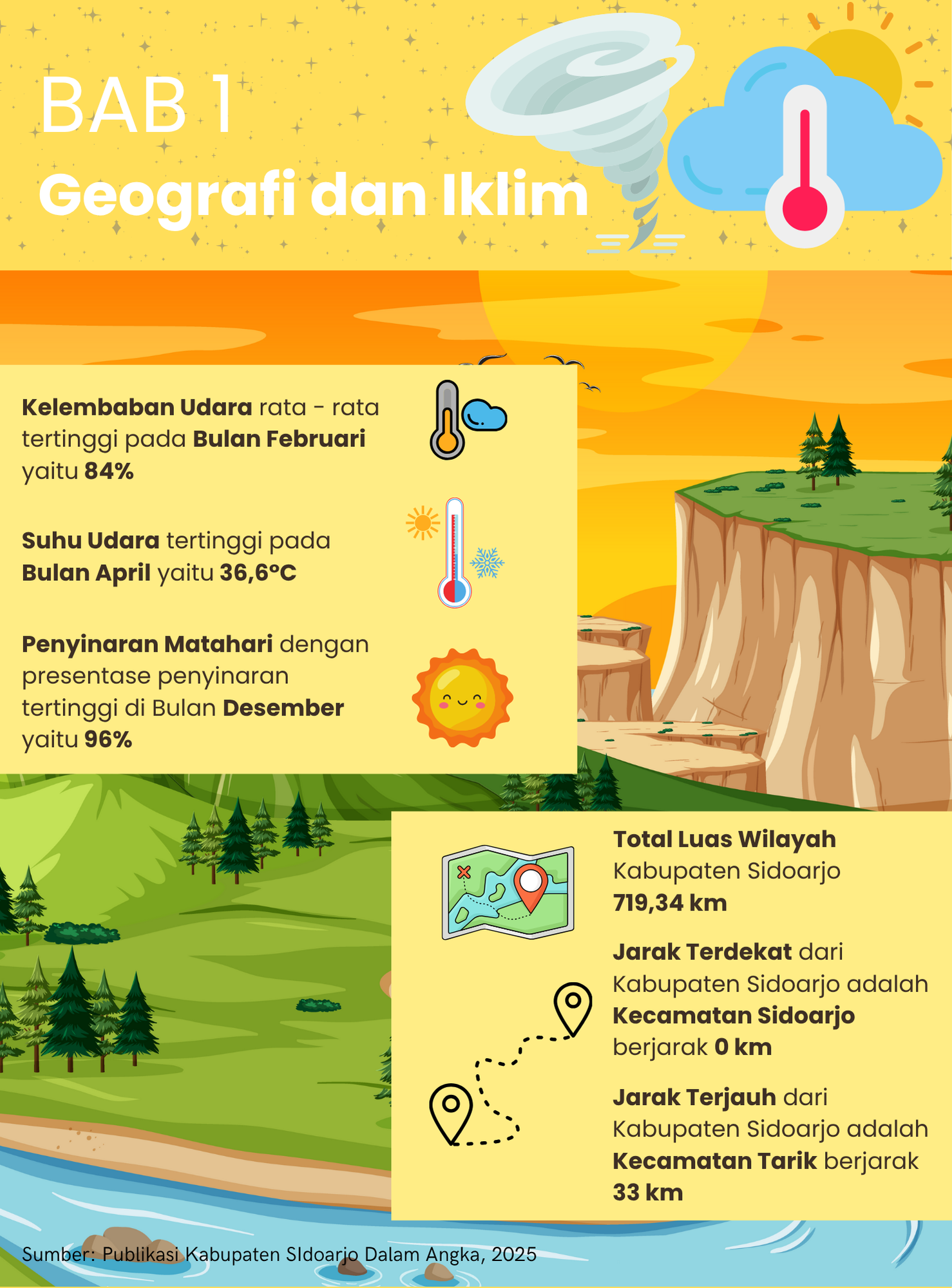 πΊοΈ BAB 1 β Geografi dan Iklim π¦οΈ Kabupaten Sidoarjo memiliki karakteristik iklim yang cukup khas. β‘οΈ Kelembaban udara tertinggi terjadi pada bulan Februari (84%),...