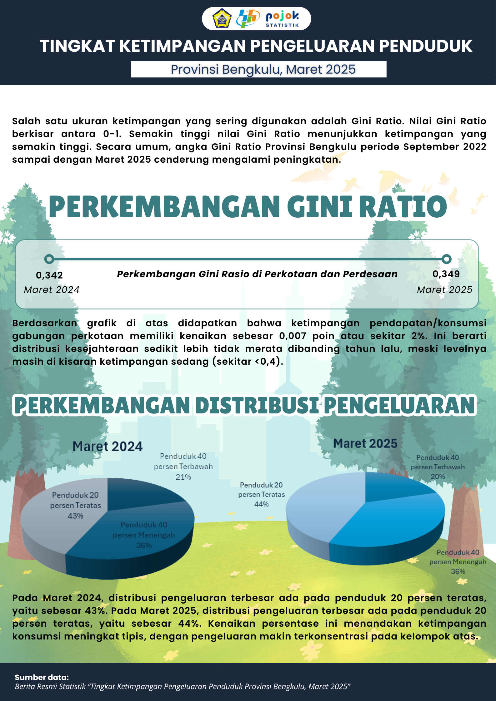 Tingkat Ketimpangan Pengeluaran Penduduk Provinsi Bengkulu, Maret 2025. Nilai Gini Ratio naik dari 0,342 (Maret 2024) menjadi 0,349 (Maret 2025), yang berarti terjadi peningkatan ketimpangan...