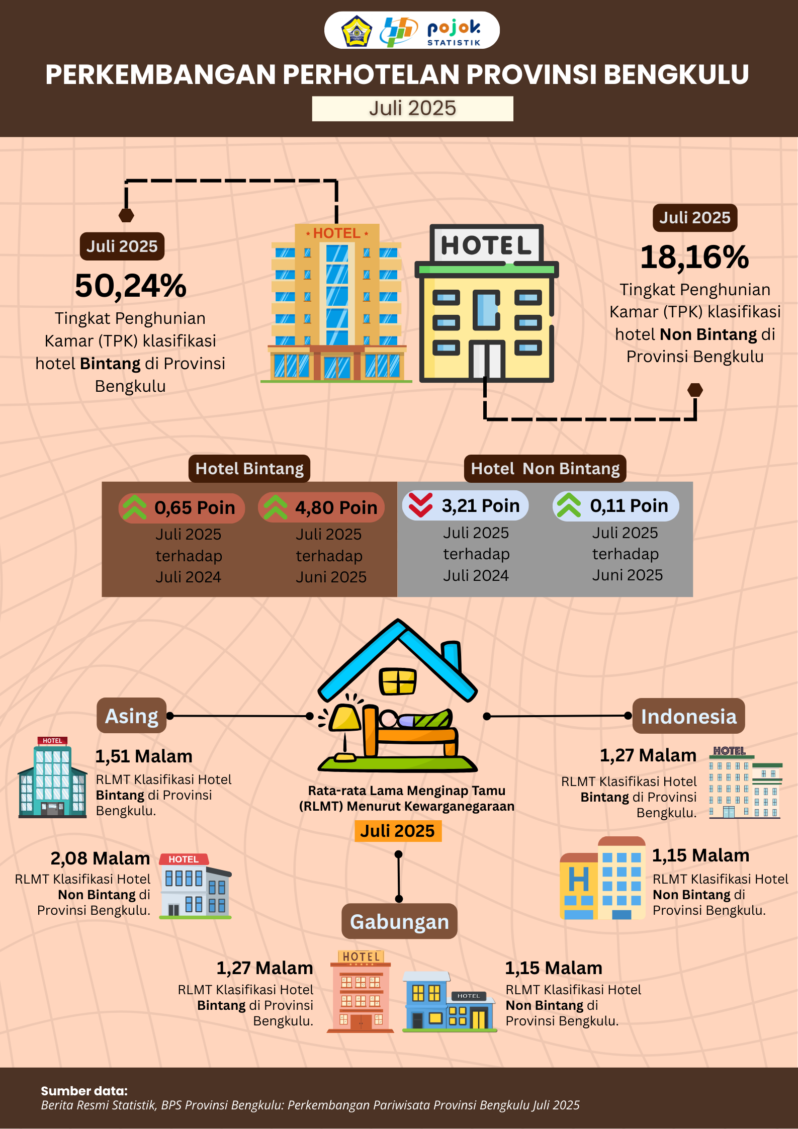 Infografis ini menunjukkan peningkatan kinerja perhotelan di Provinsi Bengkulu Juli 2025. TPK hotel berbintang mencapai 50,24% dan nonbintang 18,16%, keduanya naik dibanding bulan dan tahun...
