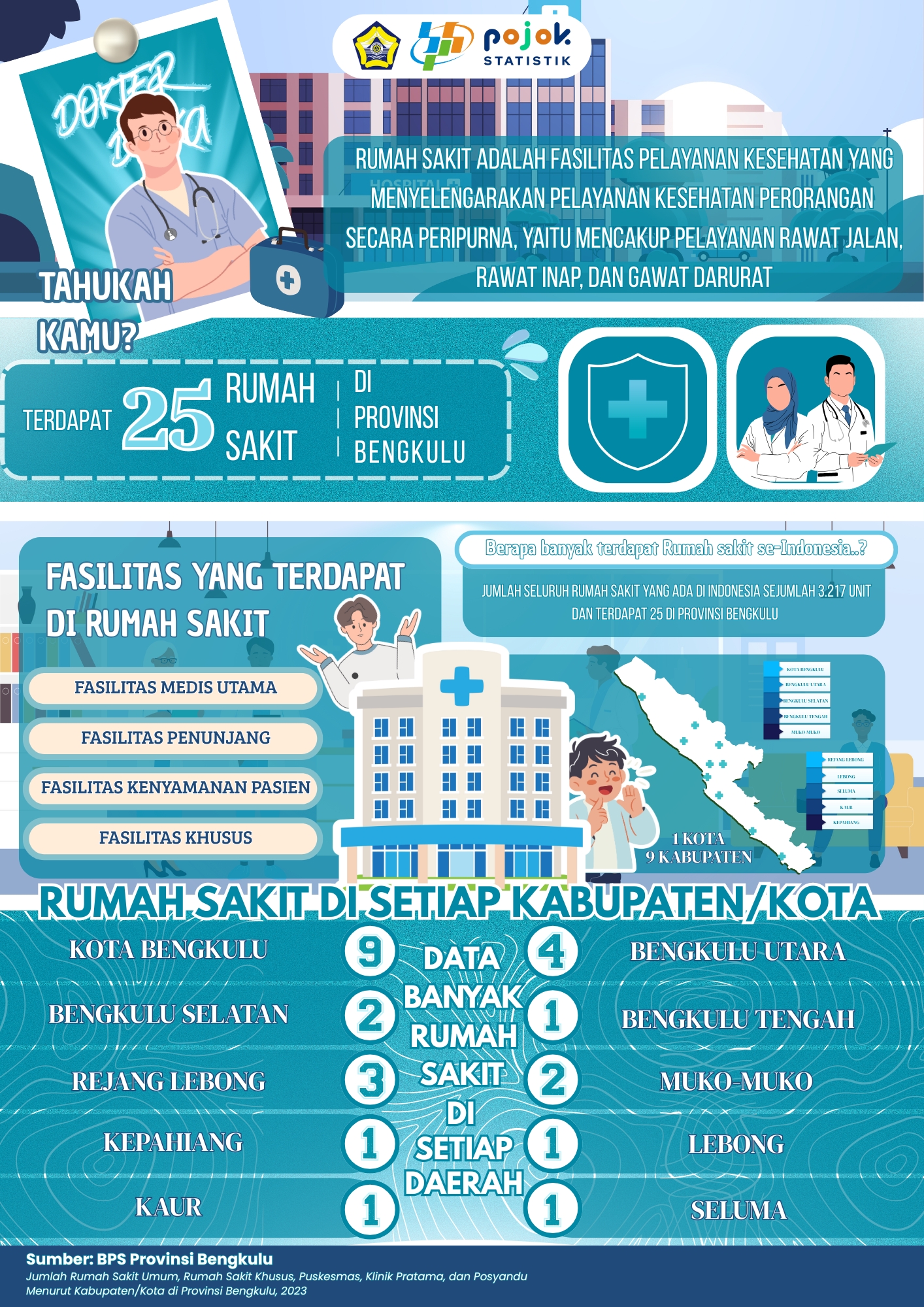 Infografis ini menampilkan informasi mengenai jumlah dan sebaran rumah sakit di Provinsi Bengkulu berdasarkan data BPS Provinsi Bengkulu tahun 2023. Tercatat terdapat 25 rumah sakit...
