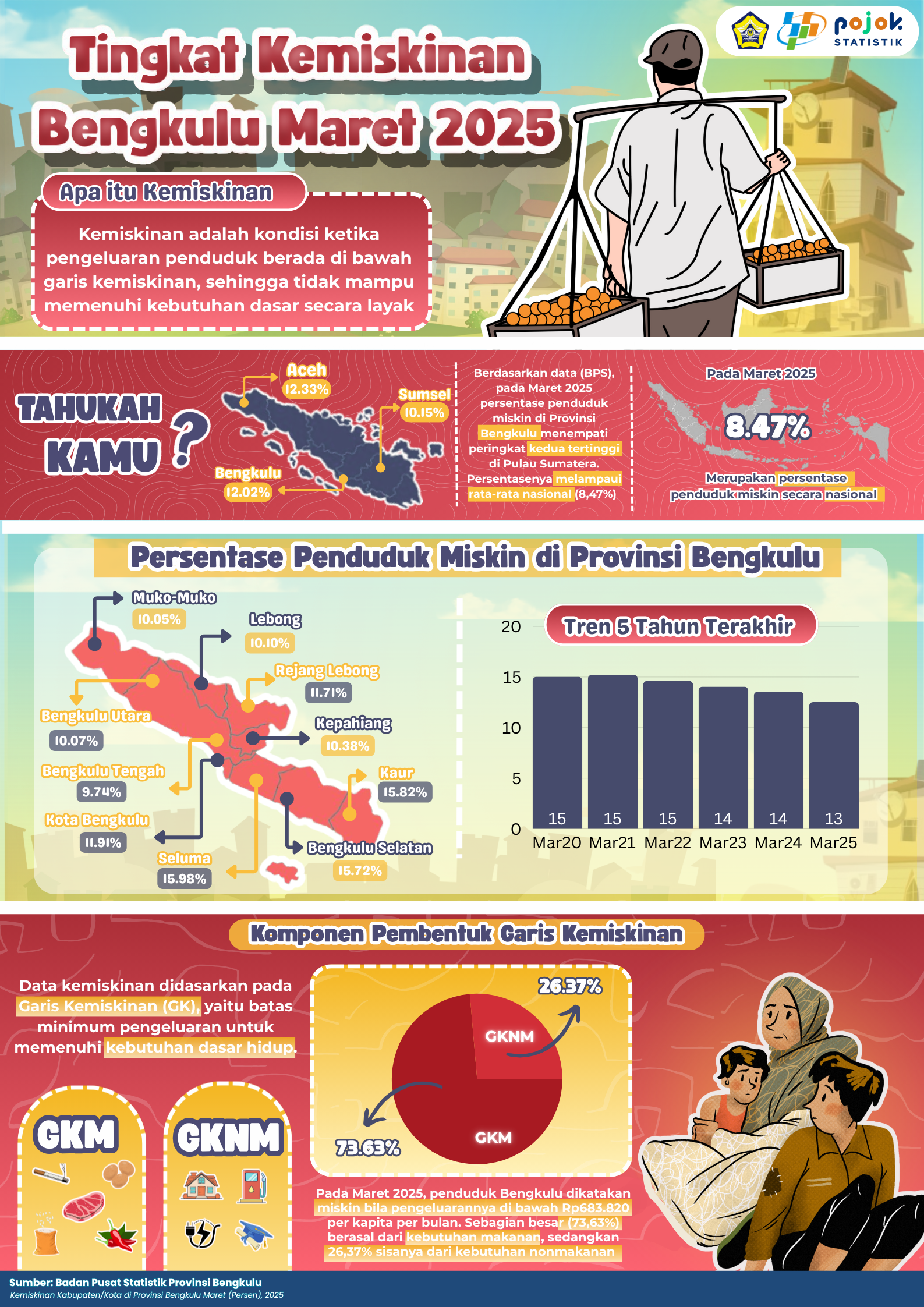 Pada Maret 2025, Provinsi Bengkulu menempati peringkat kedua tertinggi tingkat kemiskinan di Pulau Sumatera, dengan persentase 12,08%, lebih tinggi dari rata-rata nasional sebesar 8,47%. Pengukuran...