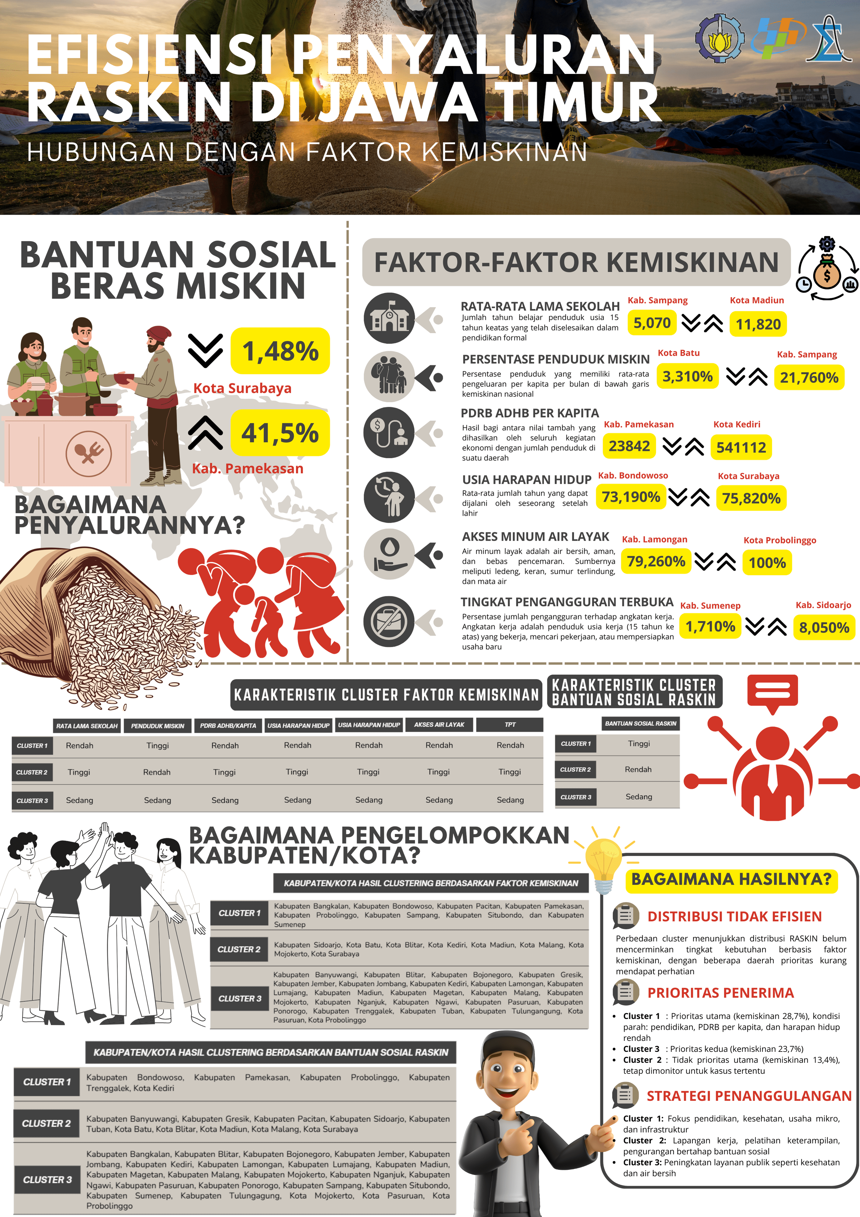 Infografis ini menyajikan data terkait efisiensi penyaluran beras miskin di Jawa Timur serta menjabarkan hubungannya dengan faktor kemiskinan