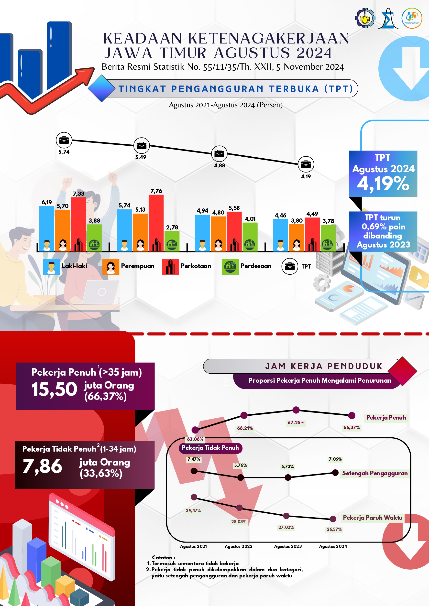 Infografis ini menyajikan data tingkat pengangguran terbuka dan jam pekerja berdasarkan Berita Resmi Statistik