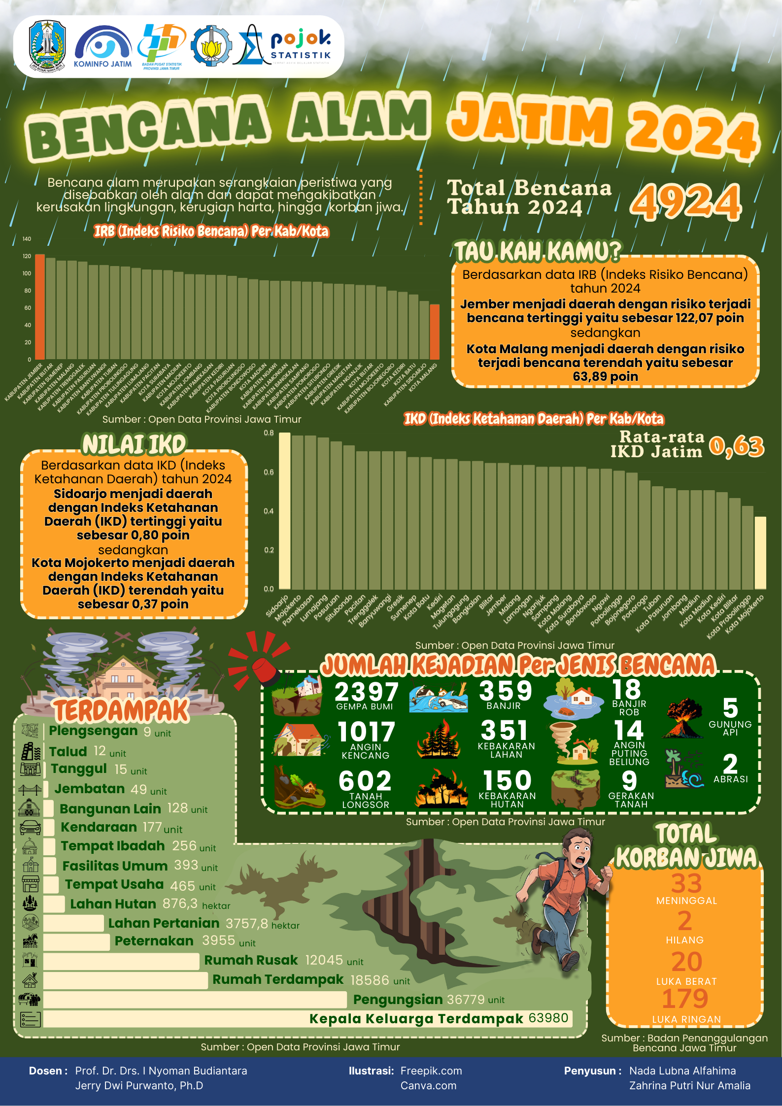 Karya ciptaan berupa infografis yang menyajikan data bencana alam yang terjadi di Jawa Timur sepanjang tahun 2024. Materi infografis dirancang secara visual dan ringkas agar...