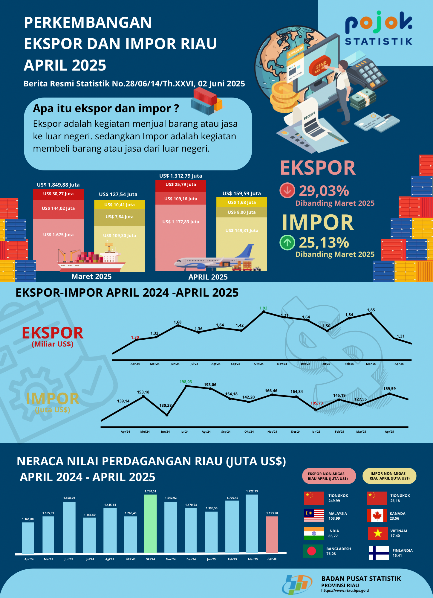 PERKEMBANGAN EKSPOR DAN IMPOR RIAU APRIL 2025