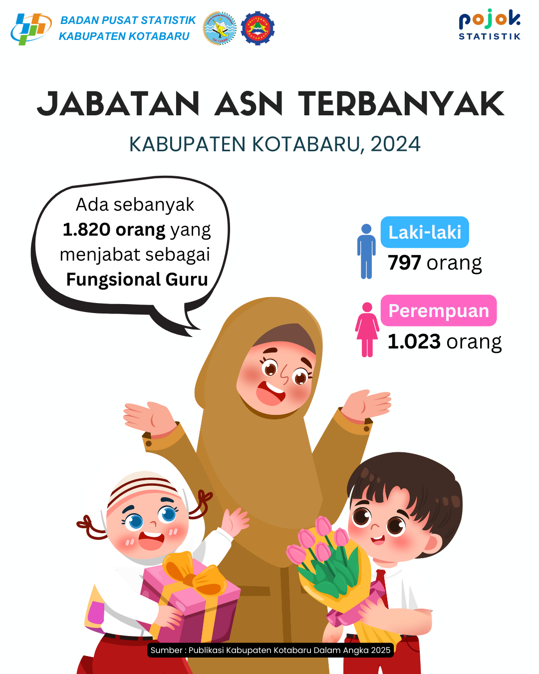 "Dari seluruh ASN yang ada di Kabupaten Kotabaru, Jabatan yang paling banyak dimiliki oleh para ASN adalah Jabatan Fungsional Guru, yang dijabat sebanyak 1.023 orang....