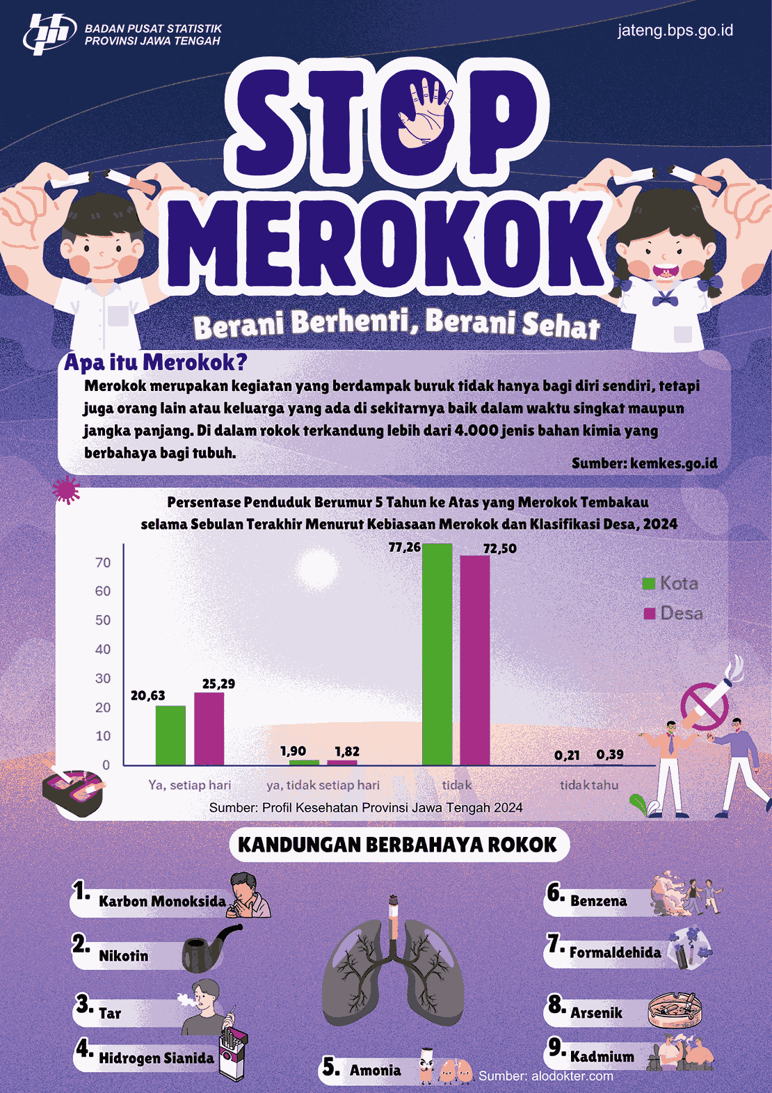 Persentase penduduk berumur 5 tahun ke atas yang merokok tembakau selama sebulan terakhir menurut kebiasaan merokok dan klasifikasi desa tahun 2024.
