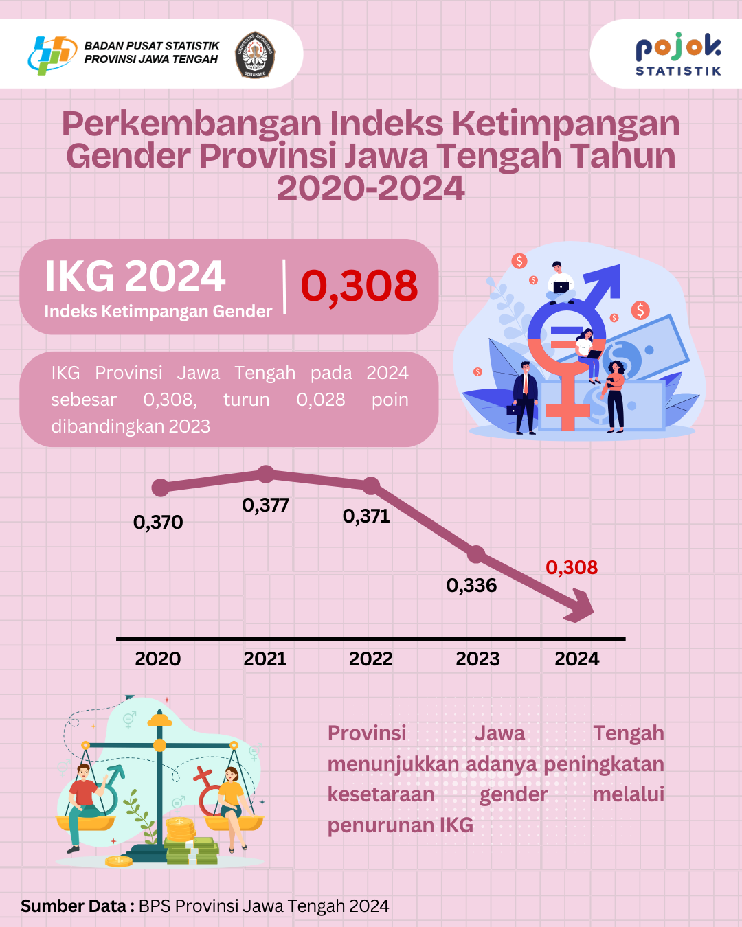 Dari perkembangan Indeks Ketimpangan Gender di Provinsi Jawa Tengah 2020-2024 cenderung mengalami penurunan.
