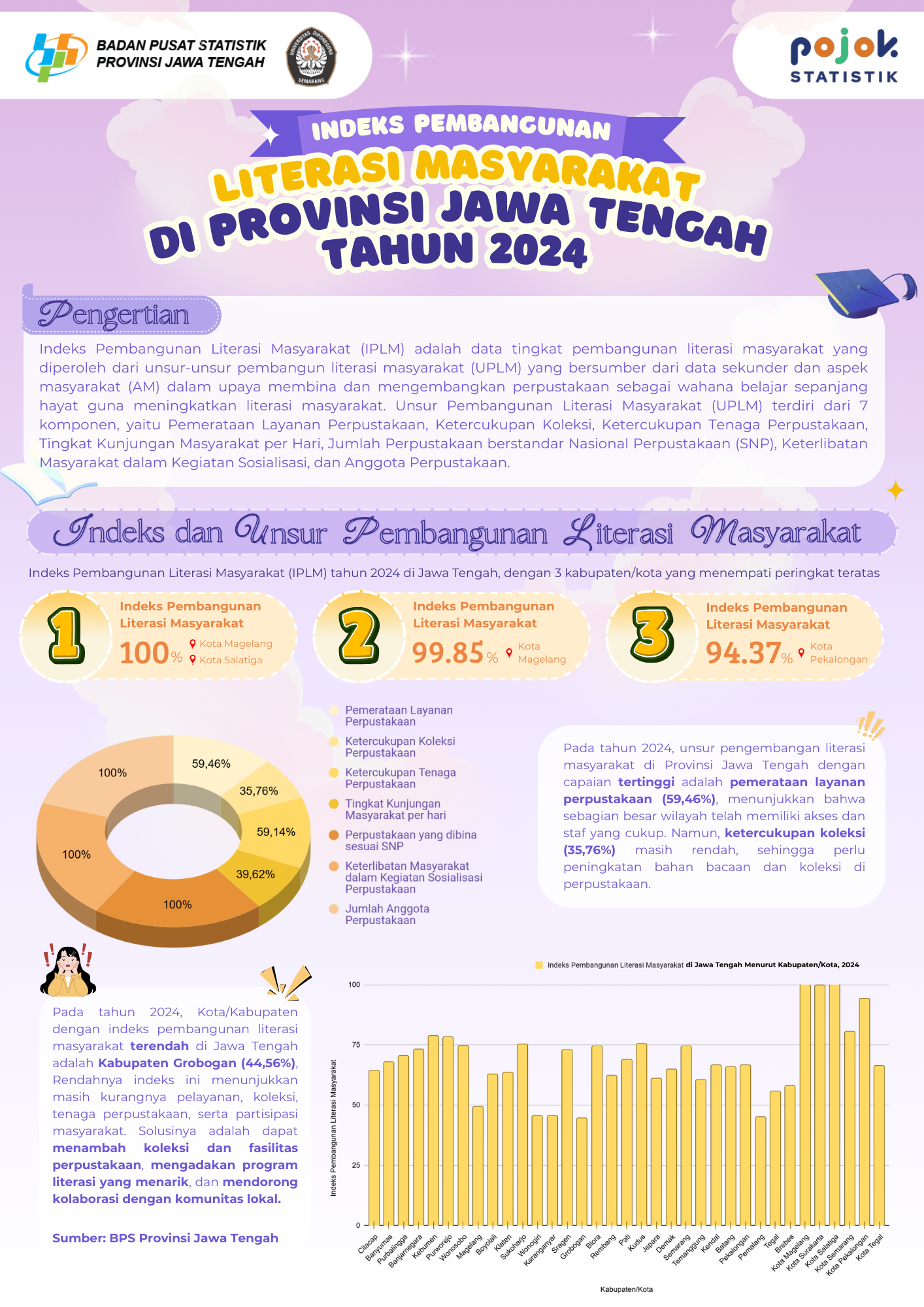Indeks Pembangunan Literasi Masyarakat (IPLM) di Provinsi Jawa Tengah tahun 2024 menggambarkan tingkat pencapaian literasi masyarakat berdasarkan tujuh unsur, yaitu pemerataan layanan perpustakaan, ketercukupan koleksi,...