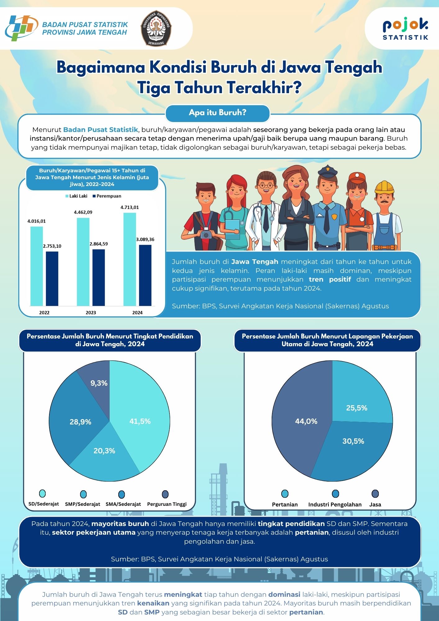 Trend jumlah buruh/karyawan/pegawai di Jawa Tengah tahun 2022-2024 serta persentasenya menurut tingkat pendidikan dan lapangan pekerjaan utama tahun 2024