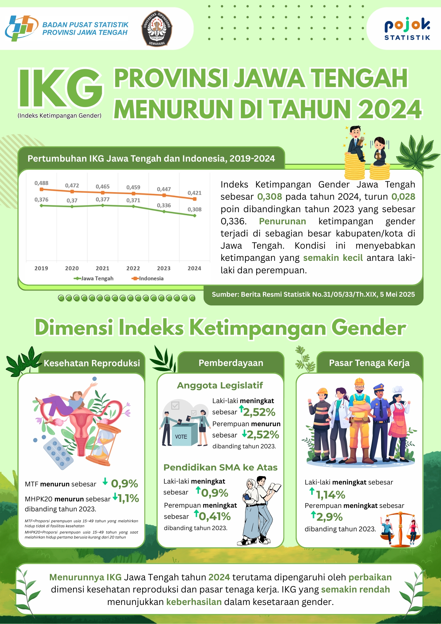 Penurunan Indeks Ketimpangan Gender (IKG) Provinsi Jawa Tengah di tahun 2024 dan Dimensi Indeks Ketimpangan Gender (IKG).