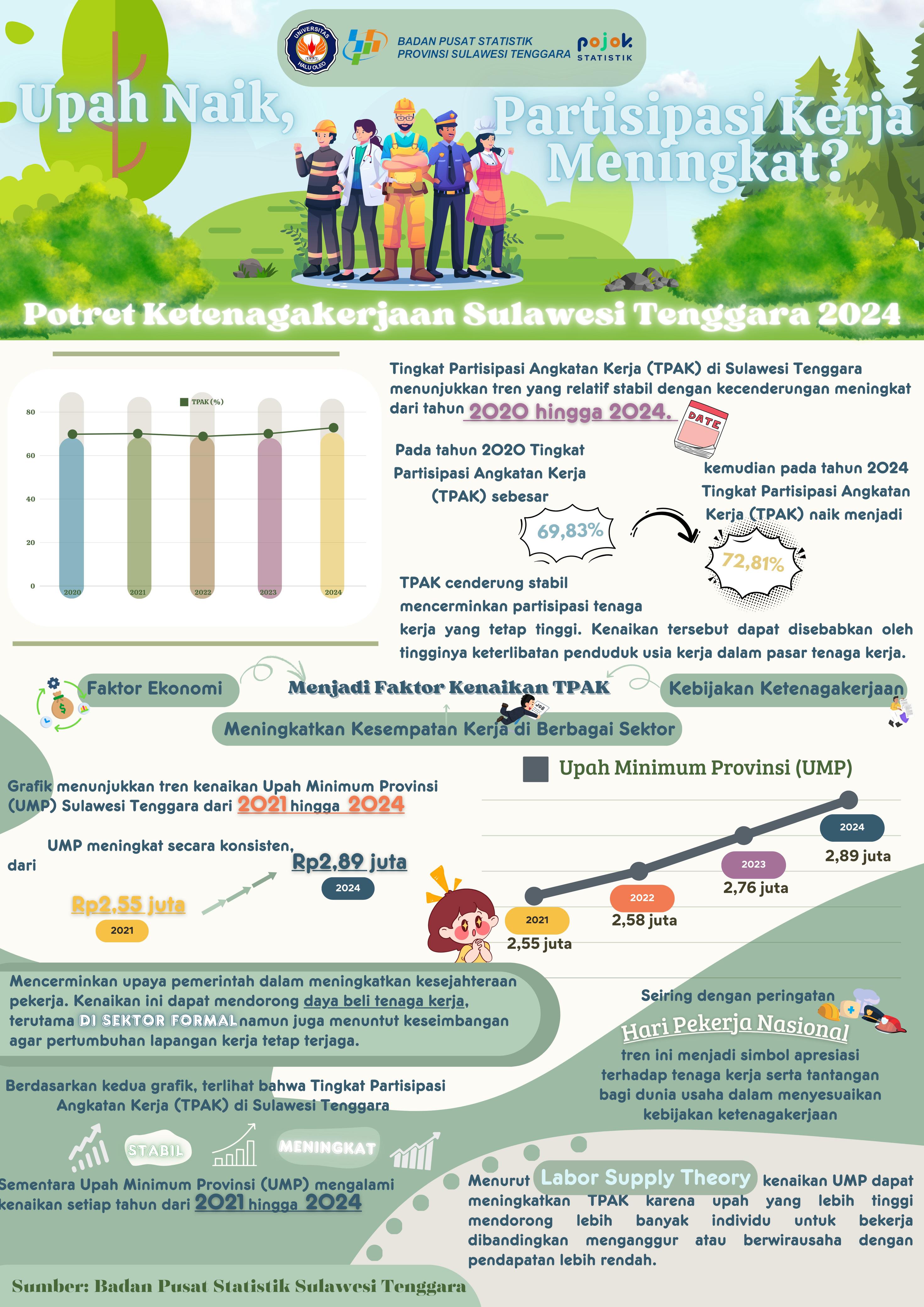 Dalam rangka Hari Pekerja Nasional, infografis ini menyoroti tren Tingkat Partisipasi Angkatan Kerja (TPAK) Sulawesi Tenggara, yang naik dari 69,83% (2020) menjadi 72,81% (2024). Salah...