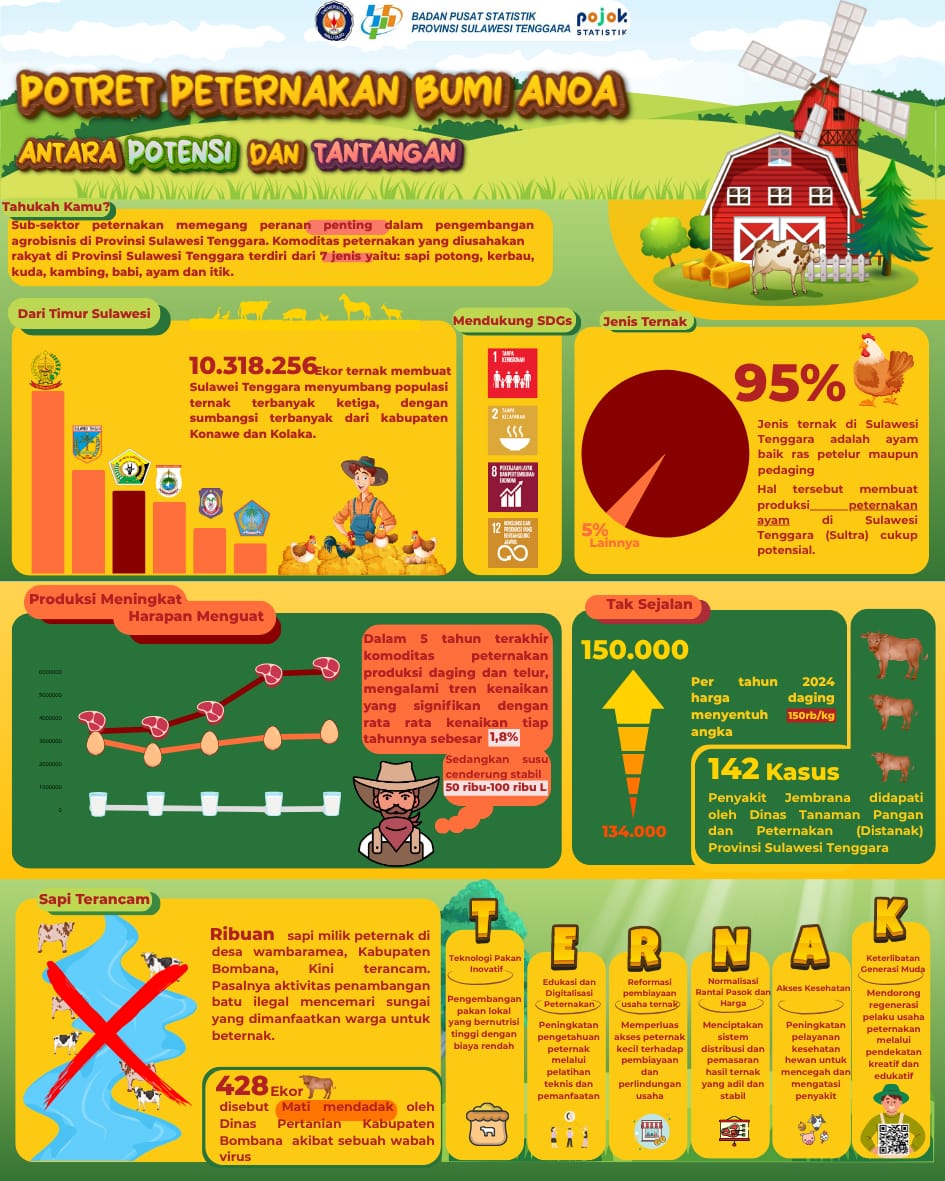 Infografis ini menunjukkan bahwa subsektor peternakan di Sulawesi Tenggara berperan penting dengan populasi ternak mencapai 10,3 juta ekor, didominasi ayam (95%). Produksi daging dan telur...