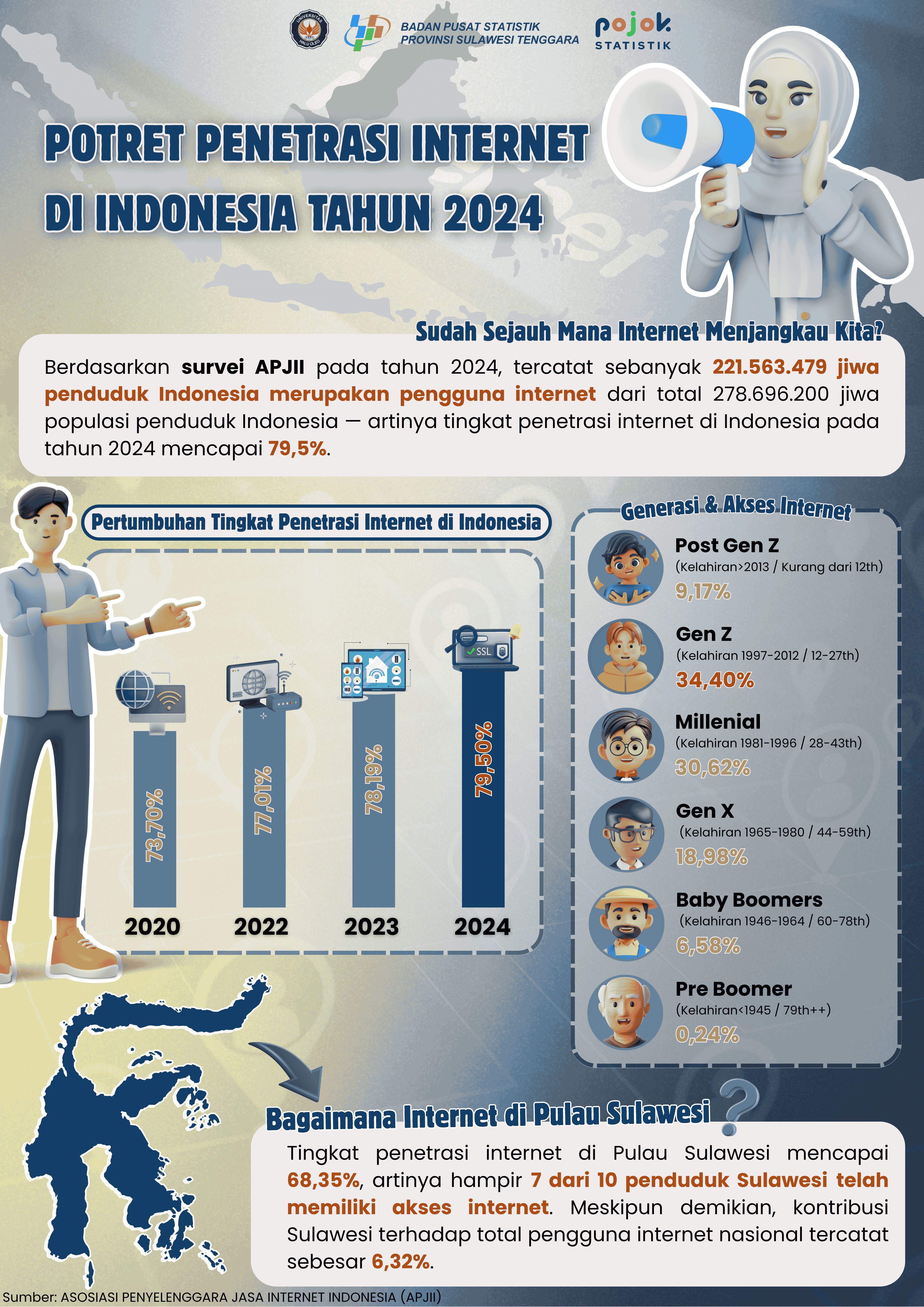 Internet kini semakin menjangkau seluruh pelosok Indonesia. Pada tahun 2024, sebanyak 79,5% penduduk Indonesia telah terhubung ke internet. Gen Z jadi pengguna terbanyak, diikuti oleh...