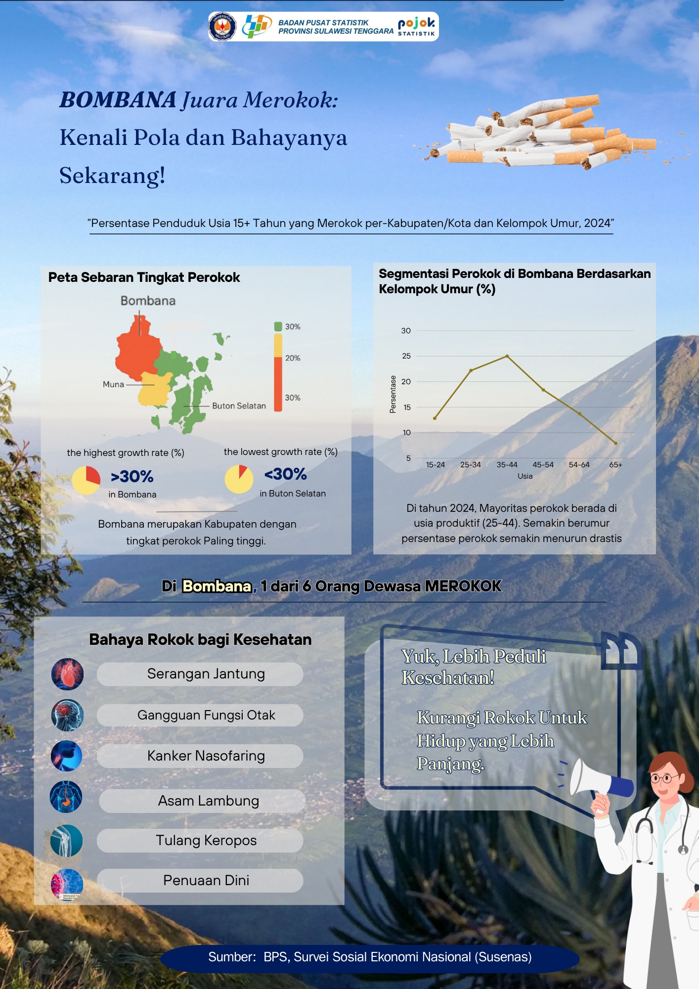 Data terbaru tahun 2024 menunjukkan bahwa Bombana menjadi kabupaten dengan persentase penduduk usia 15 tahun ke atas yang merokok paling tinggi di Sulawesi Tenggara. Mayoritas...