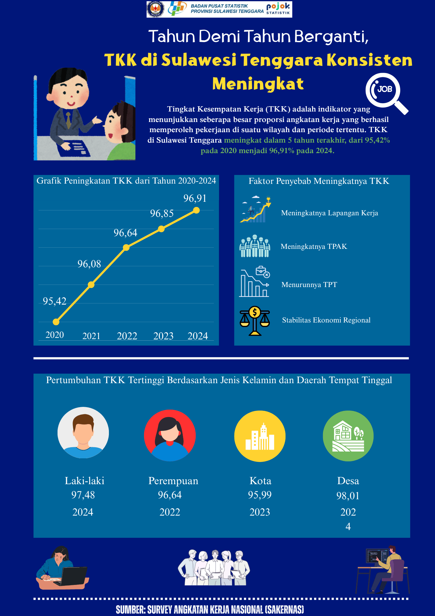 Infografis ini menggambarkan tren peningkatan Tingkat Kesempatan Kerja (TKK) di Provinsi Sulawesi Tenggara dari tahun 2020 hingga 2024. Selama lima tahun terakhir, TKK mengalami kenaikan...
