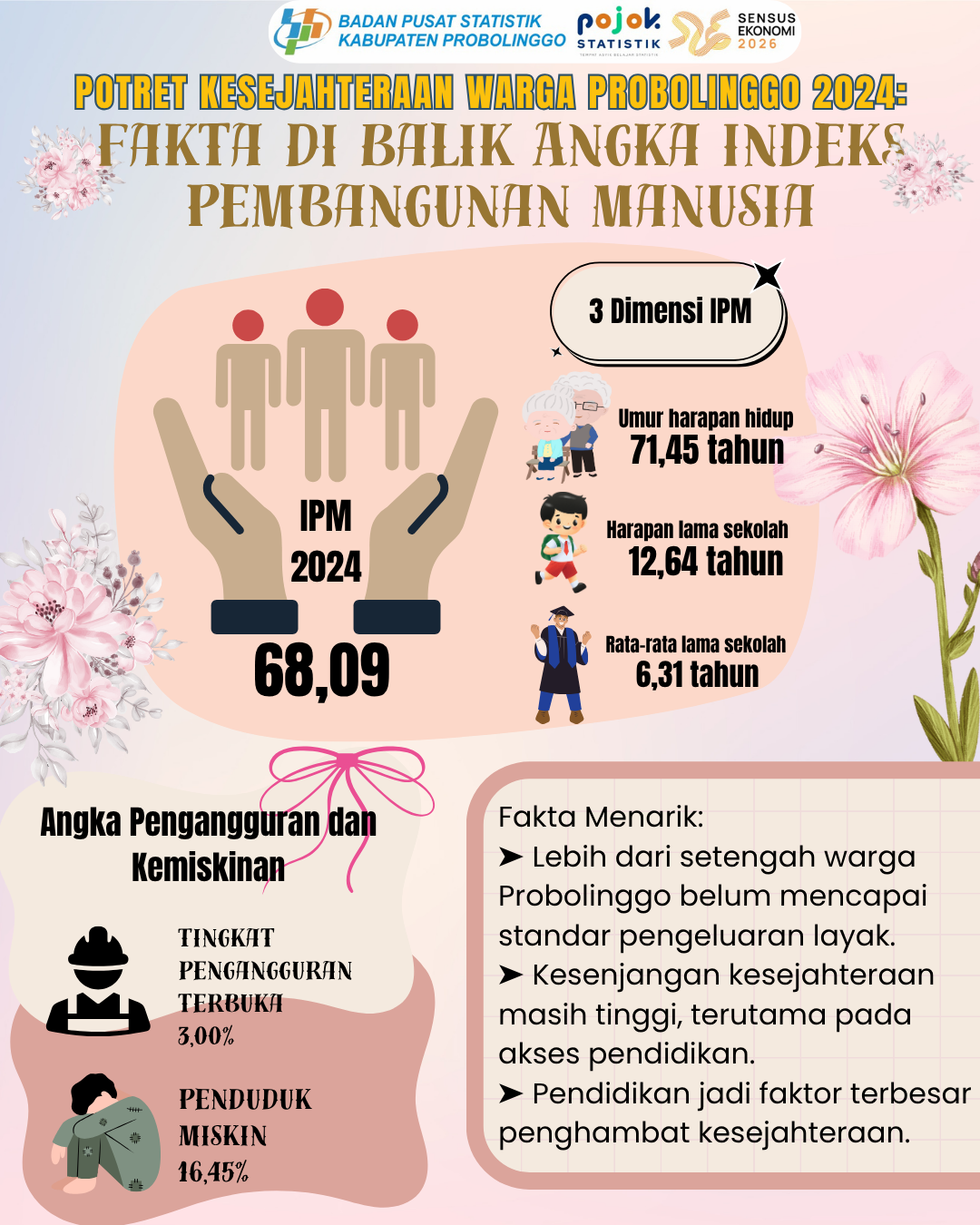 Infografis ini menampilkan potret kesejahteraan warga Probolinggo tahun 2024 berdasarkan data Indeks Pembangunan Manusia (IPM). Dengan IPM sebesar 68,09, terlihat bahwa meski angka harapan hidup...