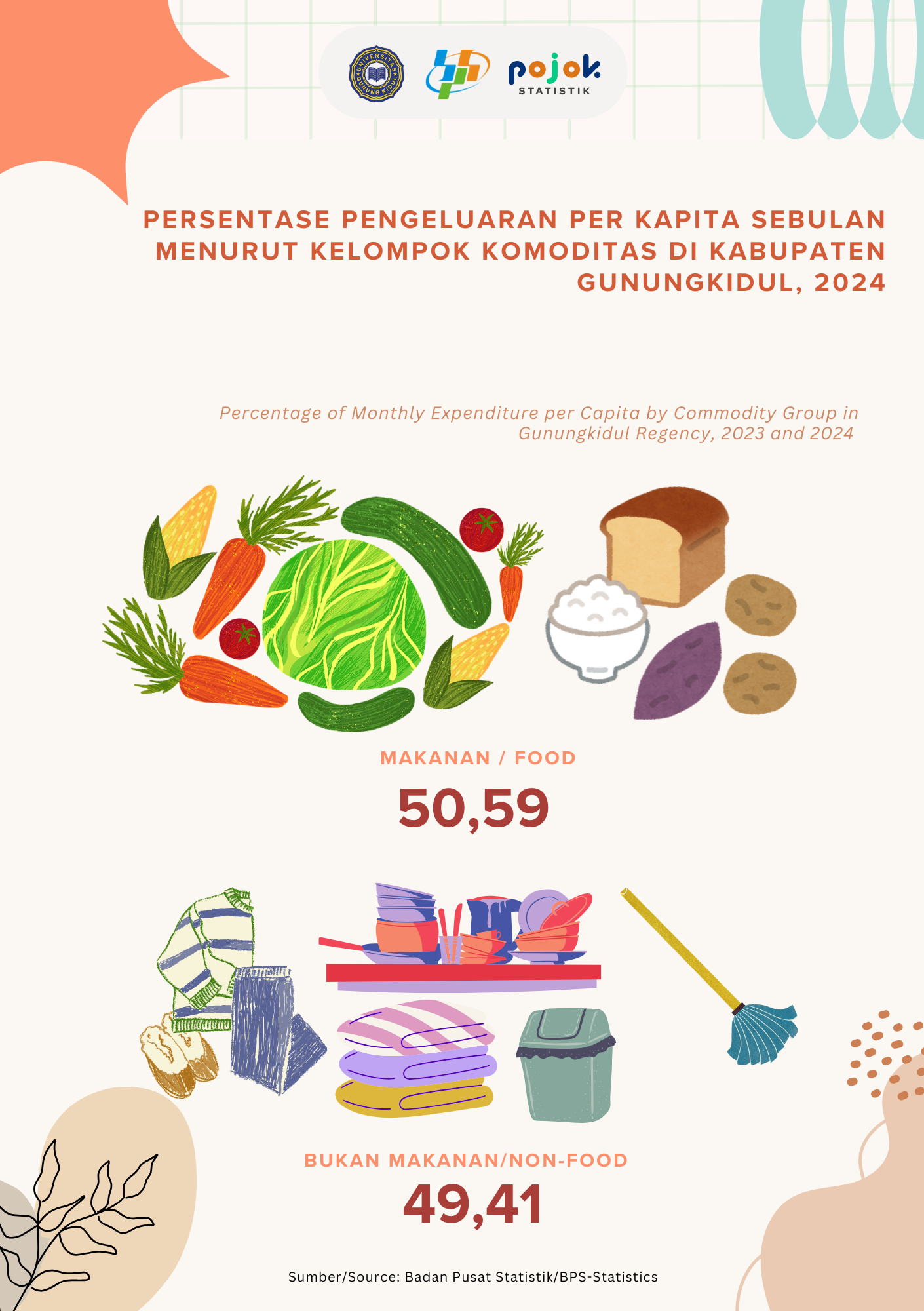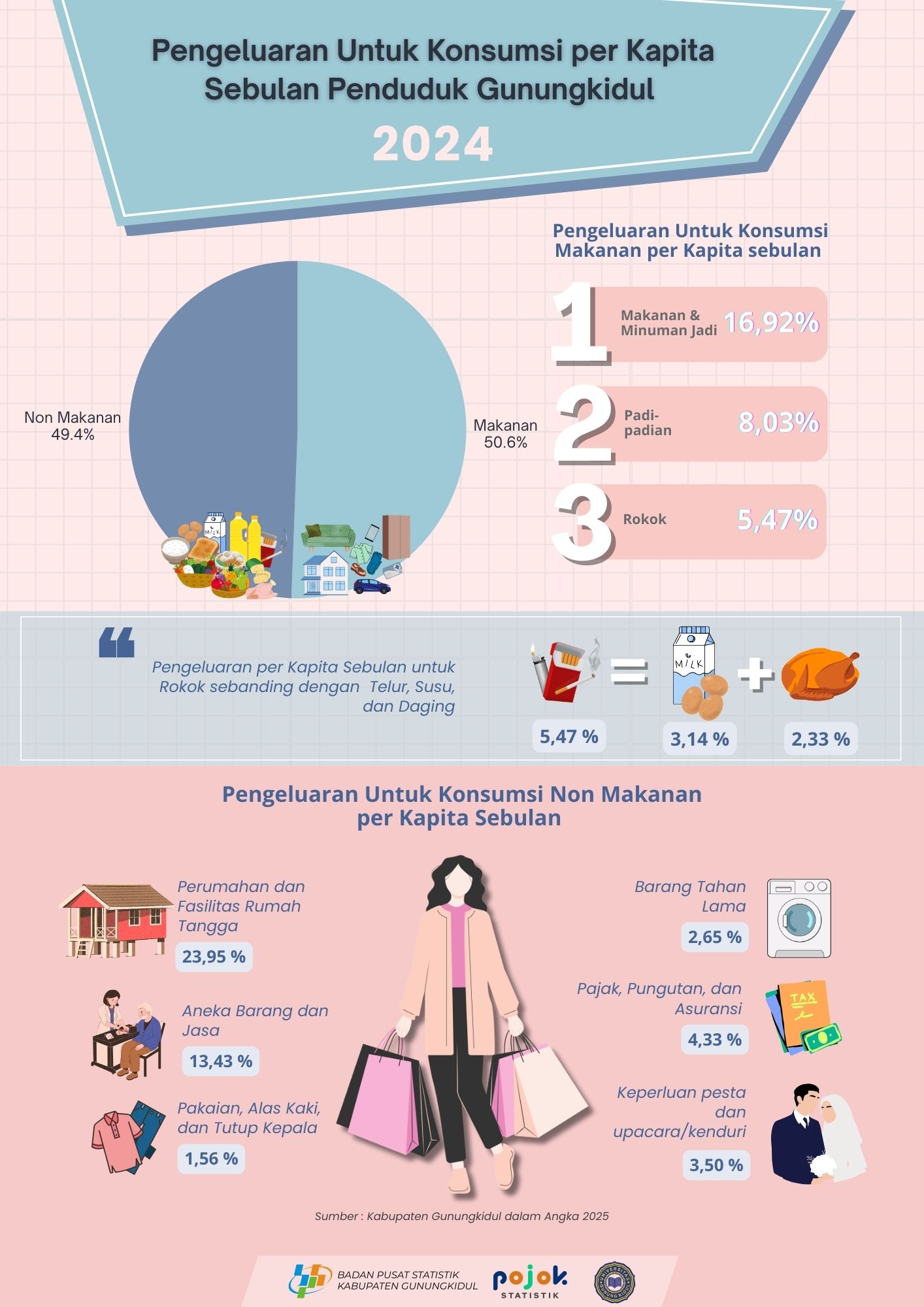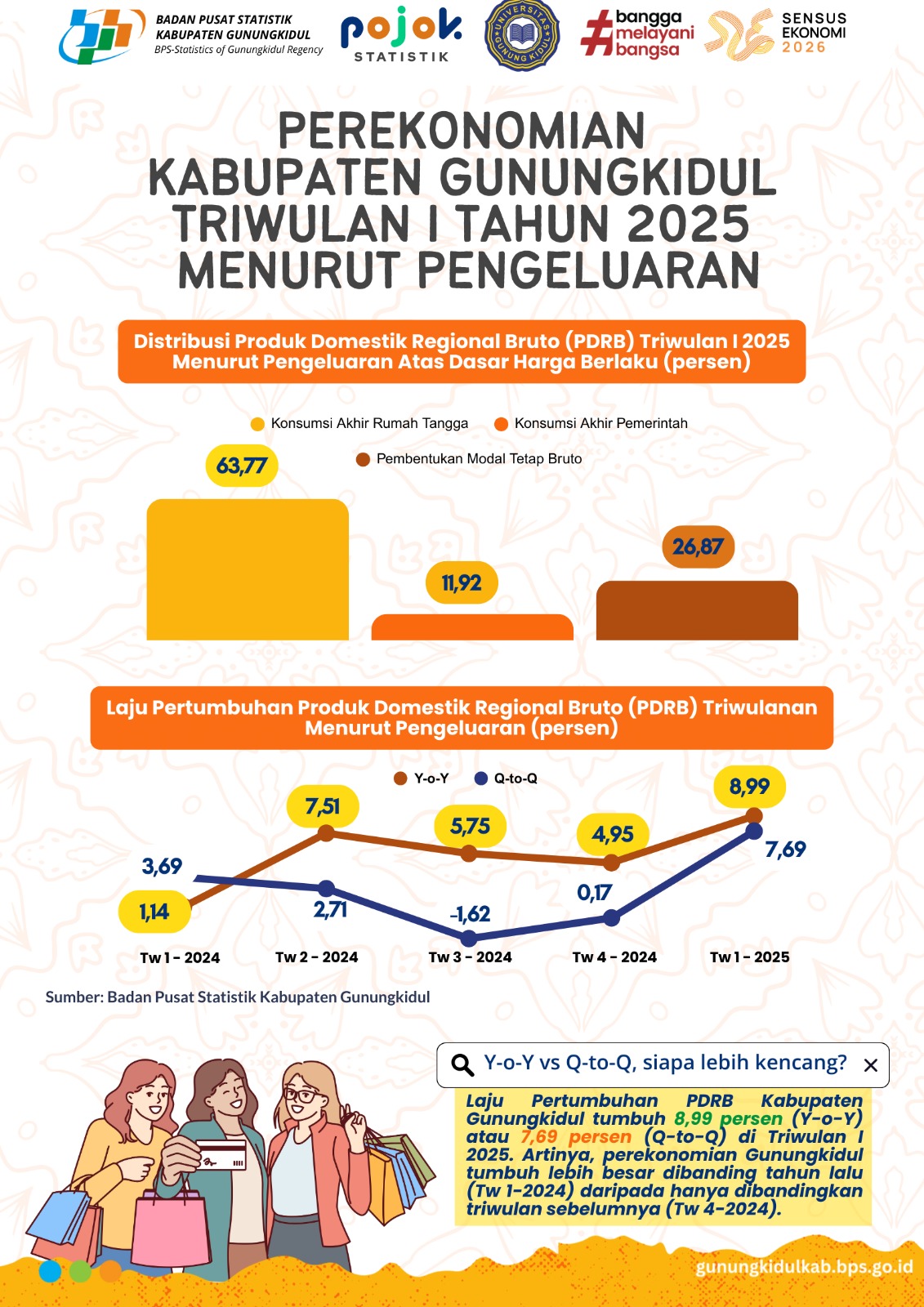 Perekonomian Kabupaten Gunungkidul Triwulan I Tahun 2025 menurut Pengeluaran share terbesar adalah Konsumsi Akhir Rumah Tangga sebesar 63,77 persen, kemudian disusul Pembentukan Modal Tetap Bruto...