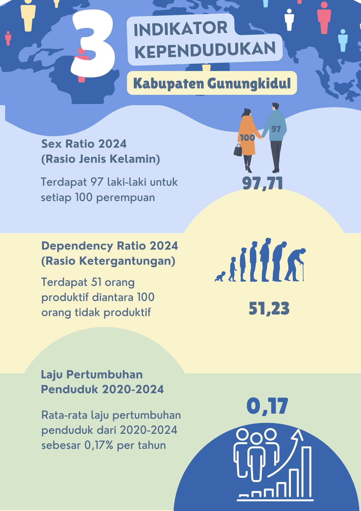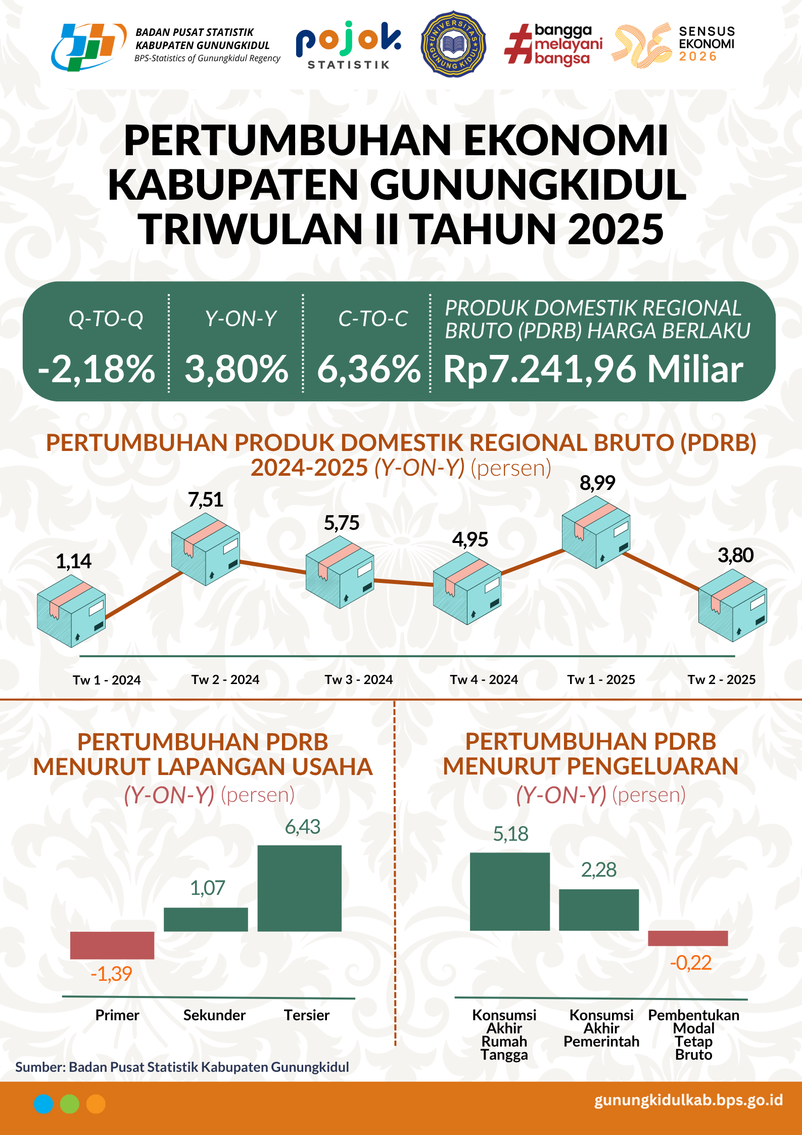 Laju pertumbuhan PDRB Kabupaten Gunungkidul triwulan II tahun 2025 tumbuh 3,80 persen (Y-o-Y) atau -2,18 persen (Q-to-Q) atau 6,36 persen (C-to-C).