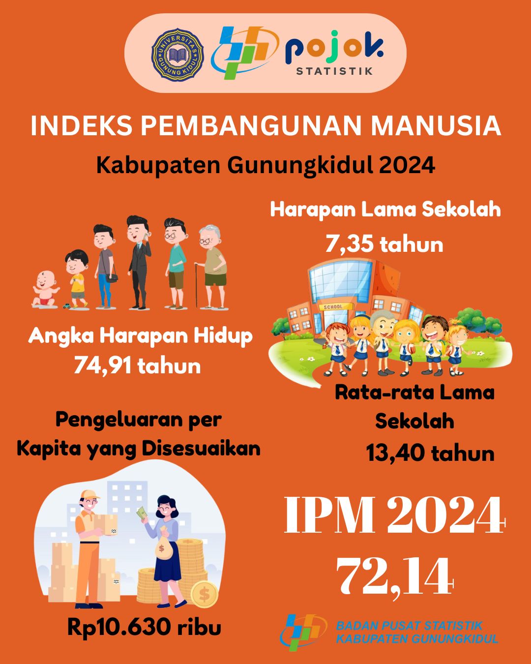 IPM Kabupaten Gunungkidul 2024 sebesar 72,14 meningkat dibandingkan 2023 sebesar 71,46