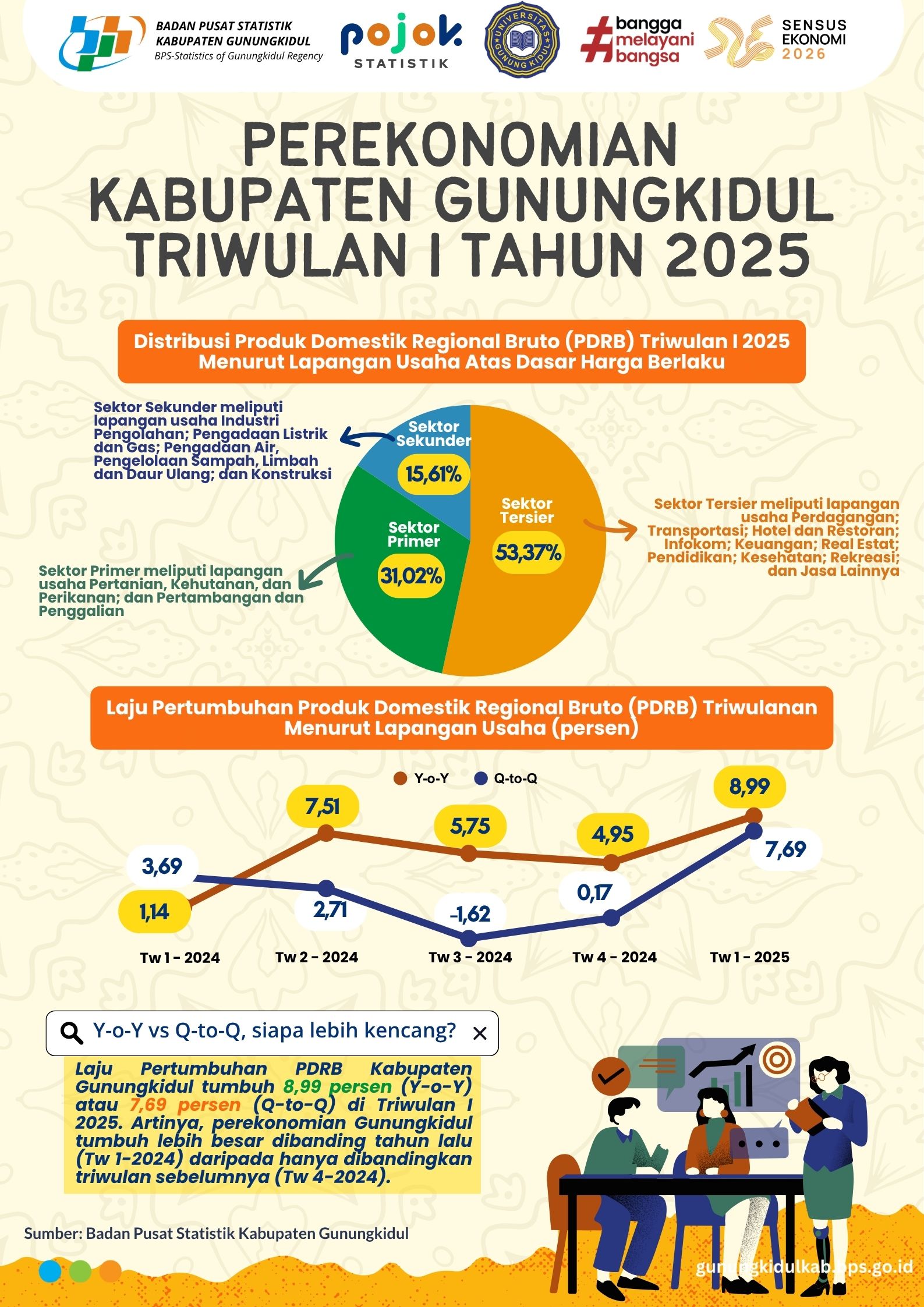 Laju Pertumbuhan PDRB Kabupaten Gunungkidul tumbuh 8,99 persen (Y-o-Y) atau 7,69 persen (Q-to-Q) di Triwulan I 2025. Artinya, perekonomian Gunungkidul tumbuh lebih besar dibanding tahun...