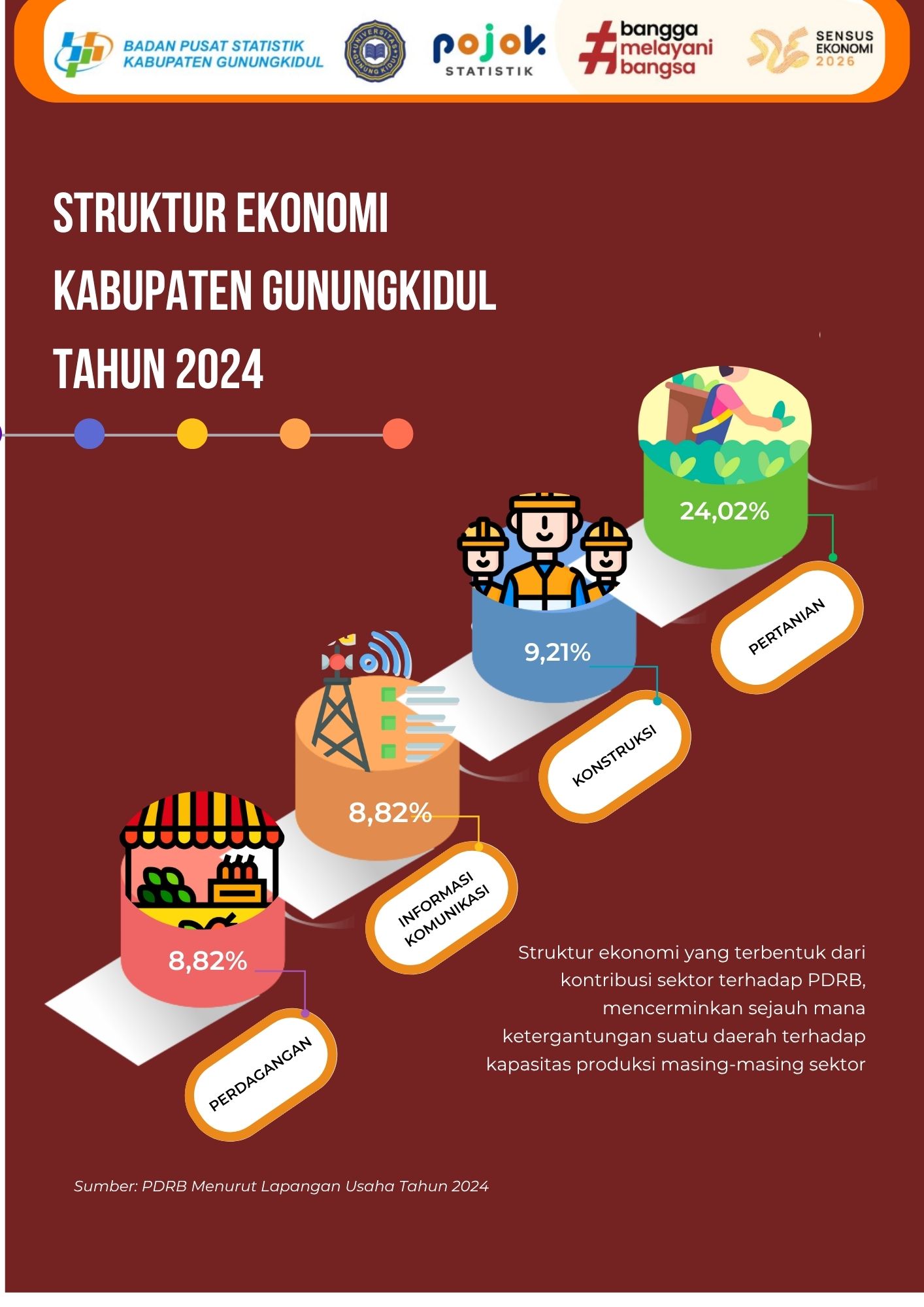 PDRB Kabupaten Gunungkidul pada Tahun 2024 mencapai 26,7 triliun rupiah (atas dasar harga berlaku) atau mencapai 16,51 triliun rupiah (atas dasar harga konstan 2010). Distribusi...