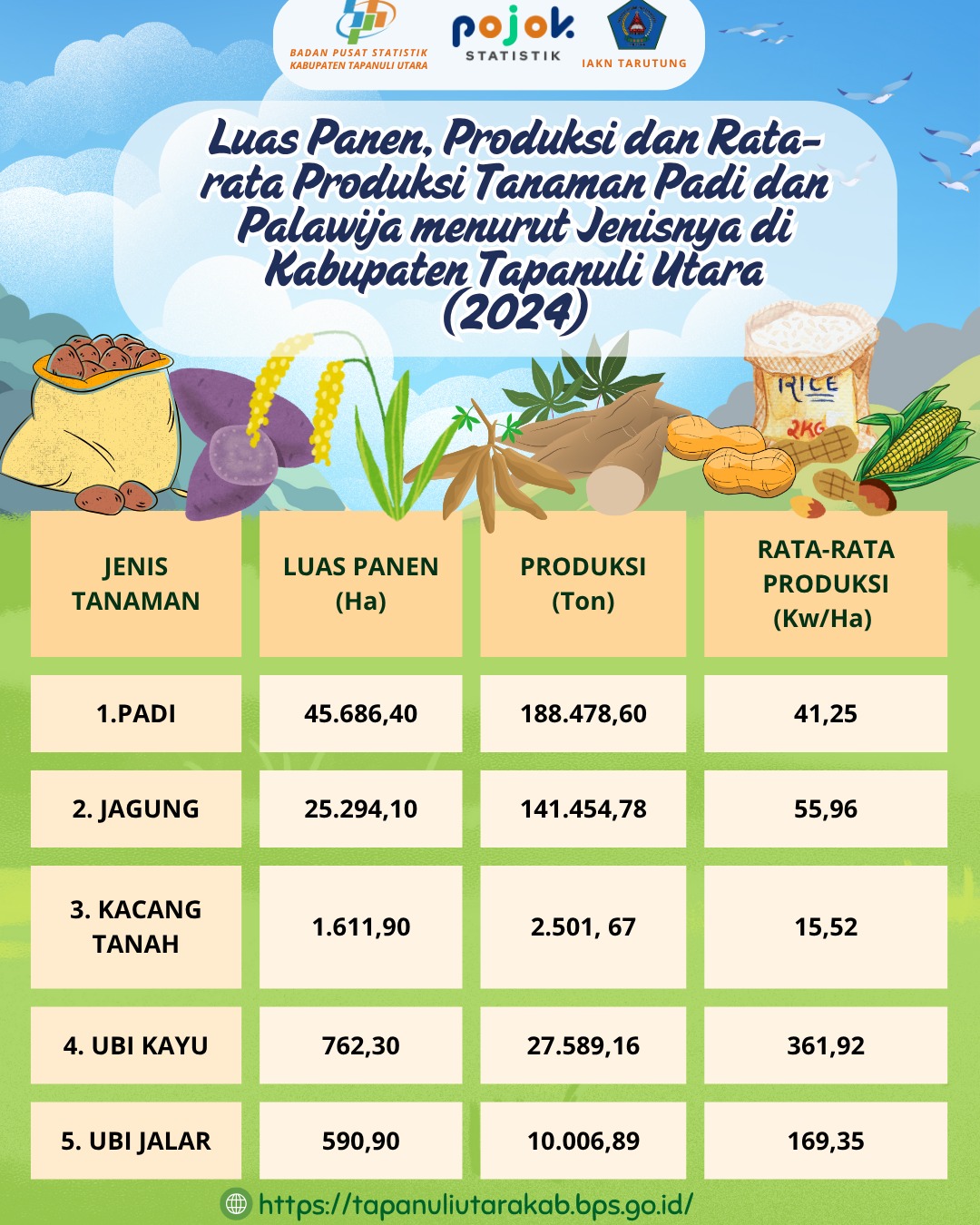 luas panen, produksi, rata-rata produksi tanaman padi dan palawija kabupaten Tapanuli Utara 2024