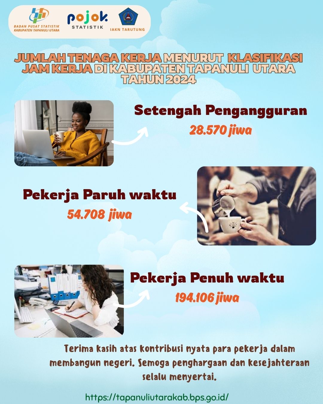 Pada tahun 2024, tenaga kerja di Kabupaten Tapanuli Utara terdiri atas berbagai kelompok berdasarkan jam kerja. Tercatat sebanyak 28.570 jiwa tergolong sebagai setengah pengangguran, yaitu...