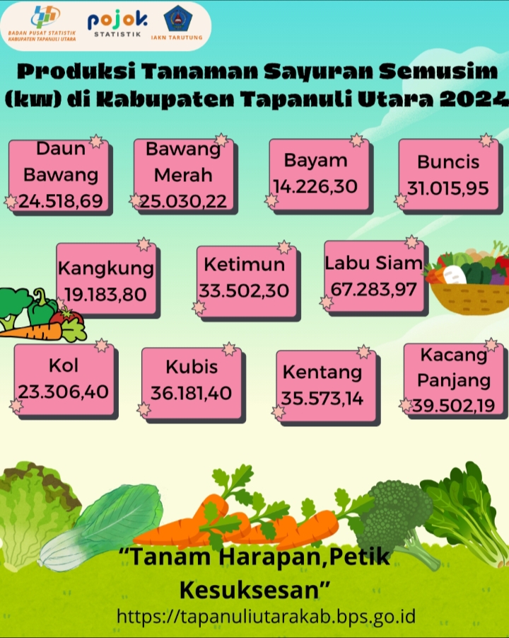 Infografis ini berisi tentang Statistik produksi tanaman sayur semusim dalam satuan kwintal (kw) di kabupaten Tapanuli Utara pada tahun 2024