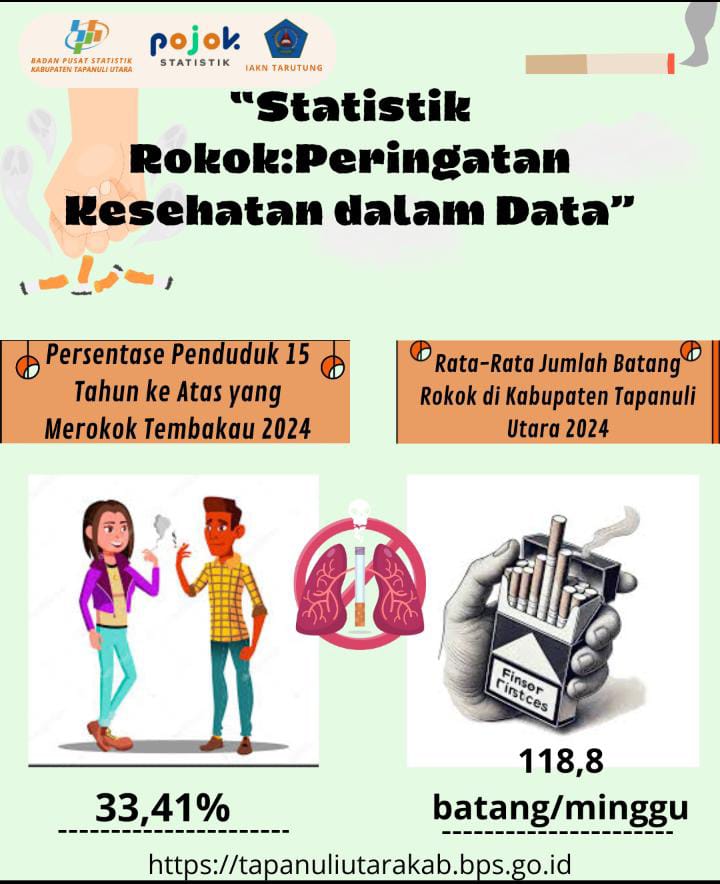 Infografis ini berisi persentase orang yang merokok pada usia 15 tahun ke atas dan jumlah batang rokok hitungan per minggu di Tapanuli Utara pada tahun...