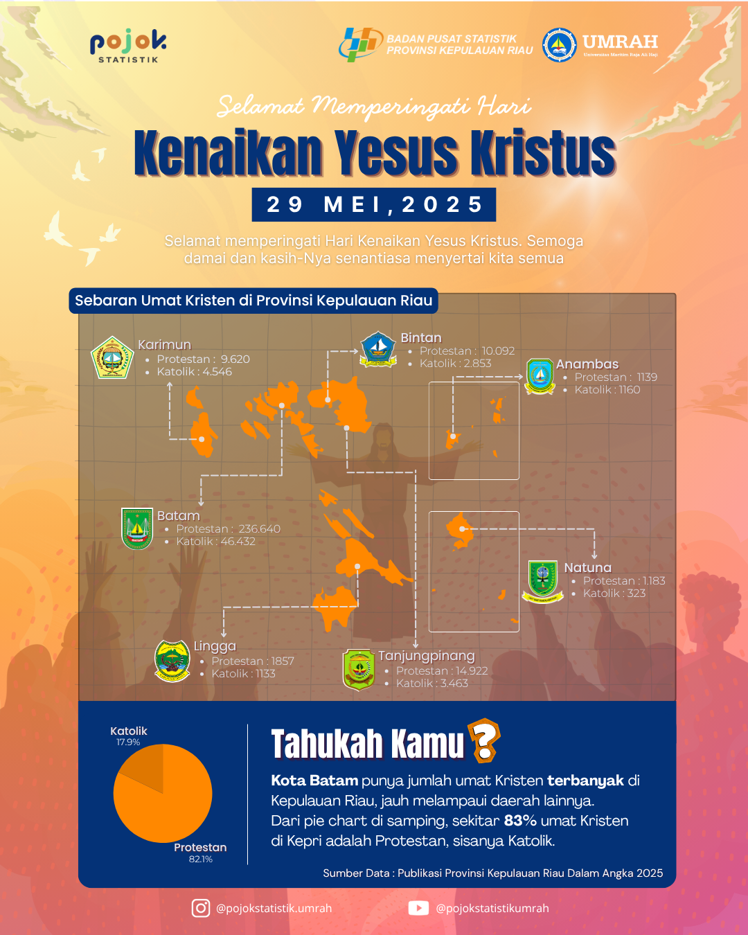 Poster ini merupakan ucapan Hari Kenaikan Yesus Kristus 2025 dari Pojok Statistik UMRAH yang disertai infografik sebaran umat Kristen di Provinsi Kepulauan Riau.