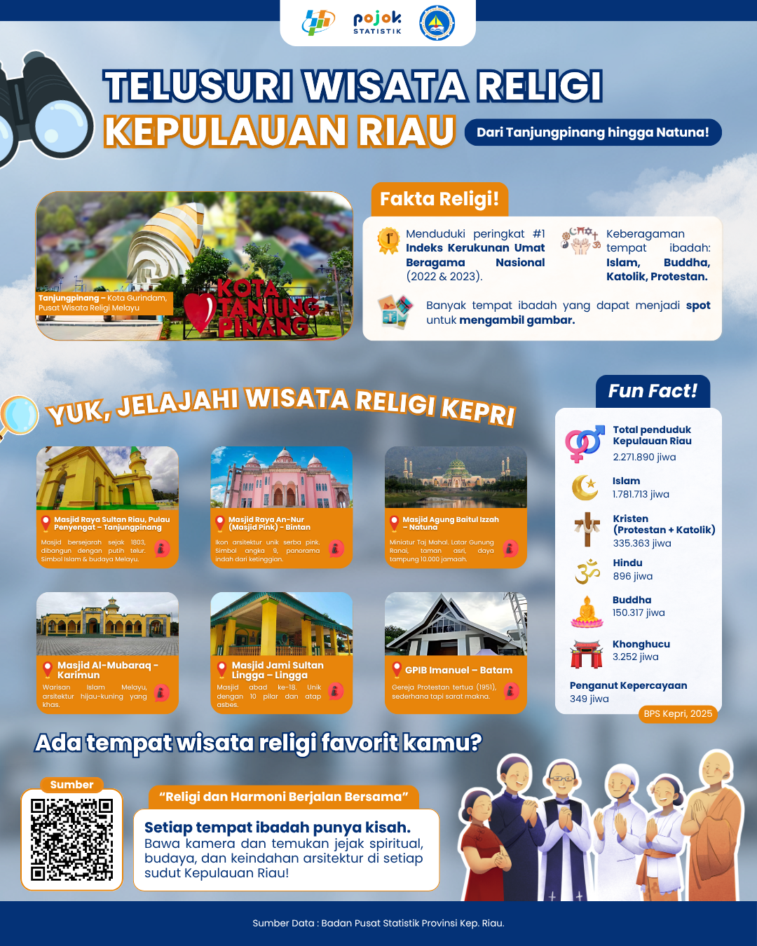 Infografis ini menyajikan informasi tentang beberapa rekomendasi objek wisata religi di Provinsi Kepulauan Riau yang terletak di beberapa kabupaten dan kota, termasuk beberapa fakta menarik...