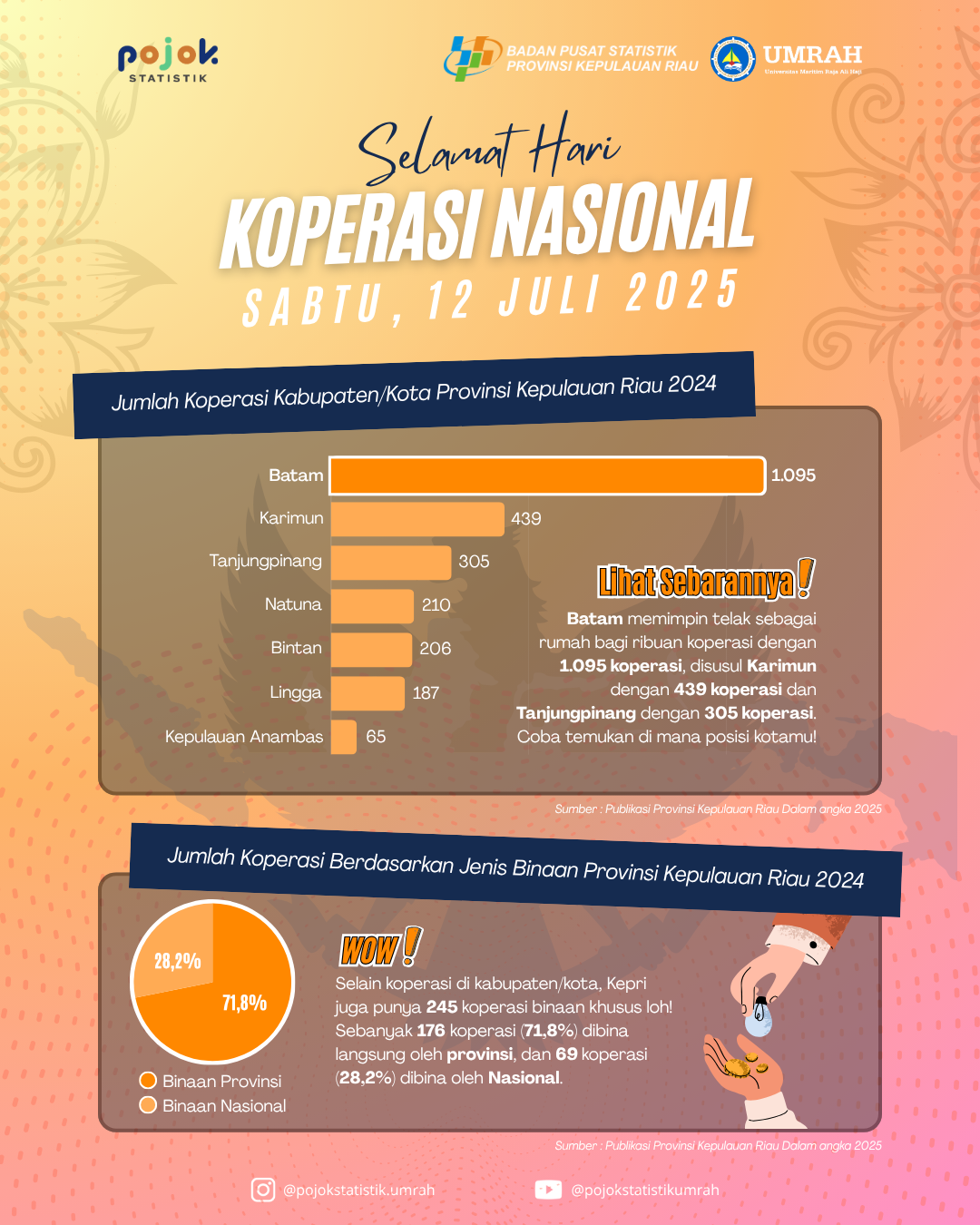 Poster ini merupakan ucapan Hari Koperasi Nasional2025 dari Pojok Statistik UMRAH yang disertai infografis Jumlah Koperasi di Provinsi Kepulauan Riau.